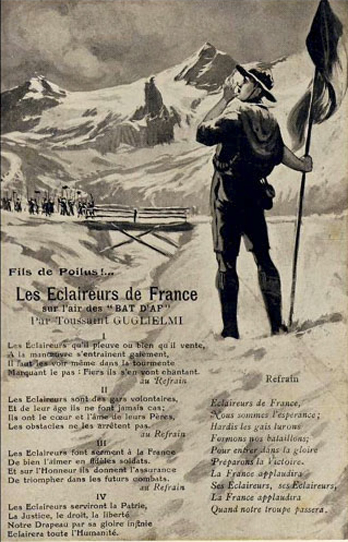 Jusqu’à la déclaration de guerre, les effectifs des E.D.F. augmenteront lentement mais sûrement : 4800 en 1913, 9600 en 1914. Dès les débuts de la guerre, les E.D.F., comme les E.F., tiennent leur place et apportent leur esprit de service.Le scoutisme garde une connotation de préparation militaire et de patriotisme justifié par la période vécue, comme l’atteste ce chant retrouvé par Jean-Marie Clerte :
