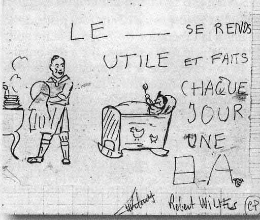 Robert Wilmes, fils de Pierre, était alors éclaireur et avait déjà un talent de dessinateur, comme l’atteste une illustration… : « Le … se rend utile et fait chaque jour une bonne action (dessin et orthographe d’époque) :
