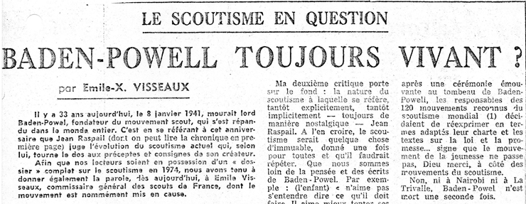 – sur le fond, et c’est tout aussi fondamental, Visseaux s’en prend à la conception du scoutisme exposée par Raspail : « À l’en croire, le scoutisme serait quelque chose d’immuable, donné une fois pour toutes et qu’il faudrait répéter. Que nous sommes loin de la pensée et des écrits de Baden-Powell ! » Ici encore, c’est une affirmation forte : le scoutisme, pour être fidèle à l’esprit de son fondateur, doit être capable de prendre conscience d l’évolution de la société et, en particulier, des besoins des jeunes.