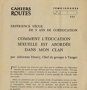 On en trouve une première trace dans une fiche des « Cahiers Route » datée de décembre 53 et relatant une « expérience vécue de cinq ans de coéducation », sous la plume de Adrienne Houry, chef de groupe à Tanger.