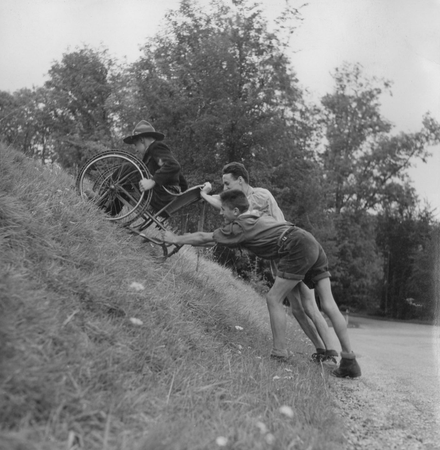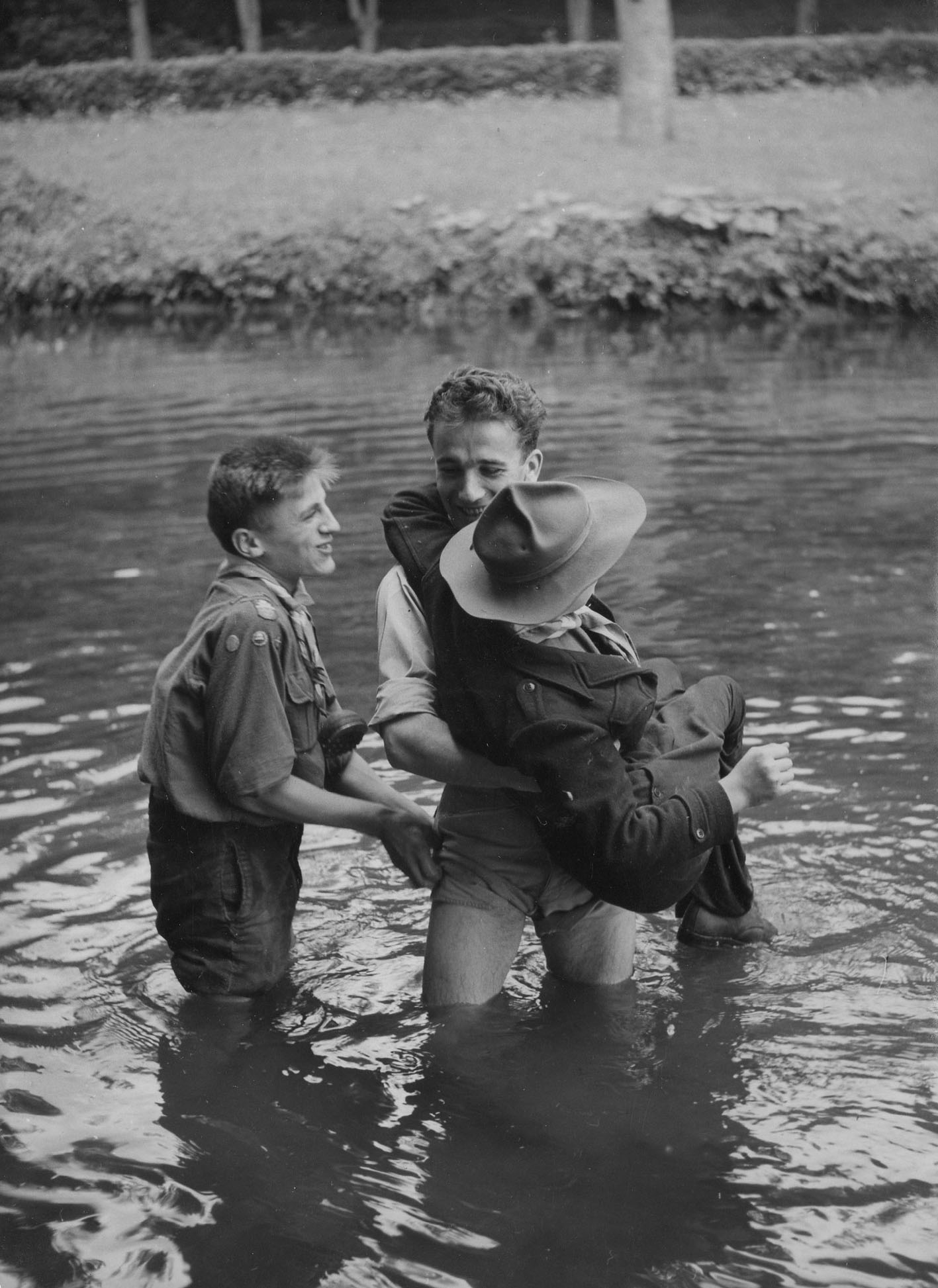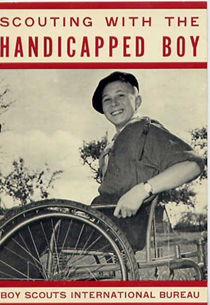 Aujourd’hui on peut écrire la suite : nous avons ramené tout le monde au camp, fait sécher (séparément), garçons, uniformes, chariots et fauteuils… Et, le lendemain matin, photographié le magnifique sourire de l’un des garçons, dont la photo a beaucoup servi, en particulier pour illustrer le programme du « Sotr inhabituel » (voir plus haut) et la couverture de la plaquette « scouting vith the handicapped boy » publiée en 1958 par le « Boy Scouts International Bureau » avec une belle introduction de son directeur, Dan C. Spry, C.B.E., D.S.O., C.D…