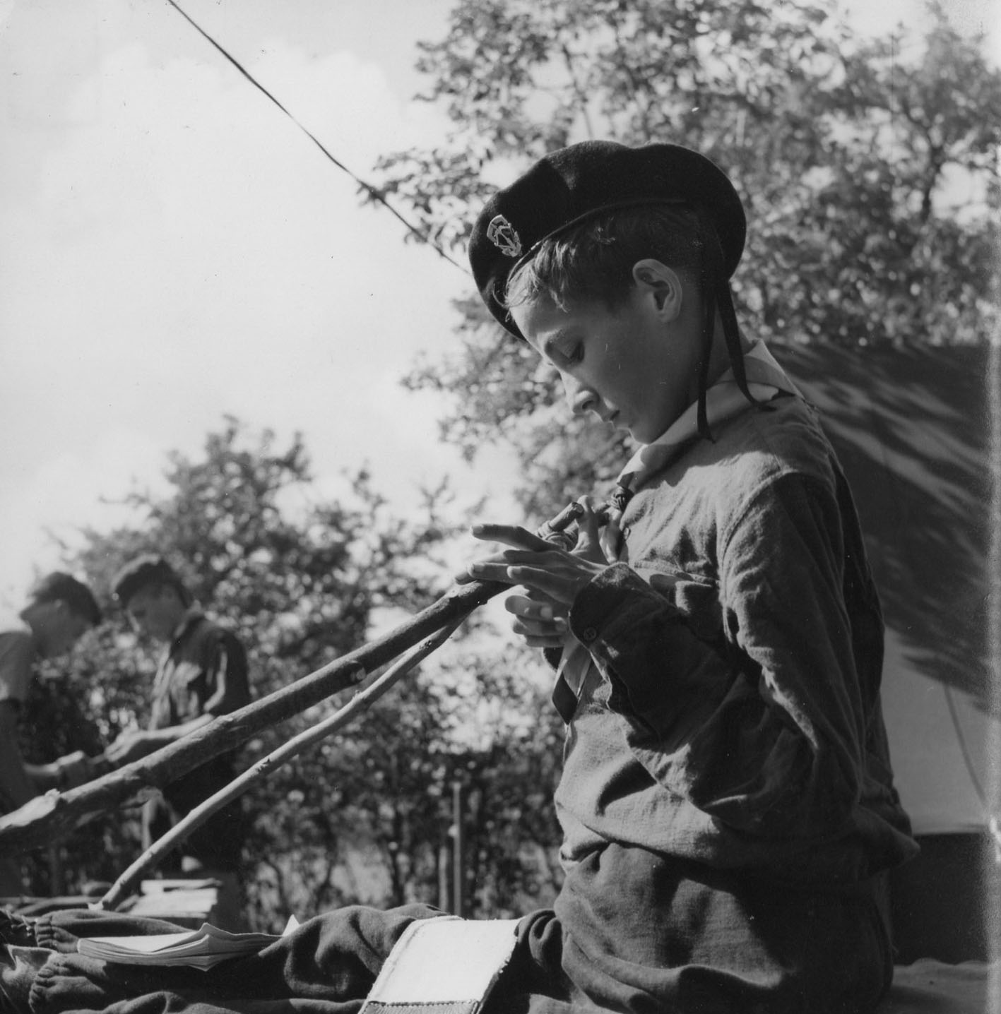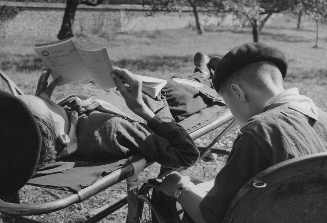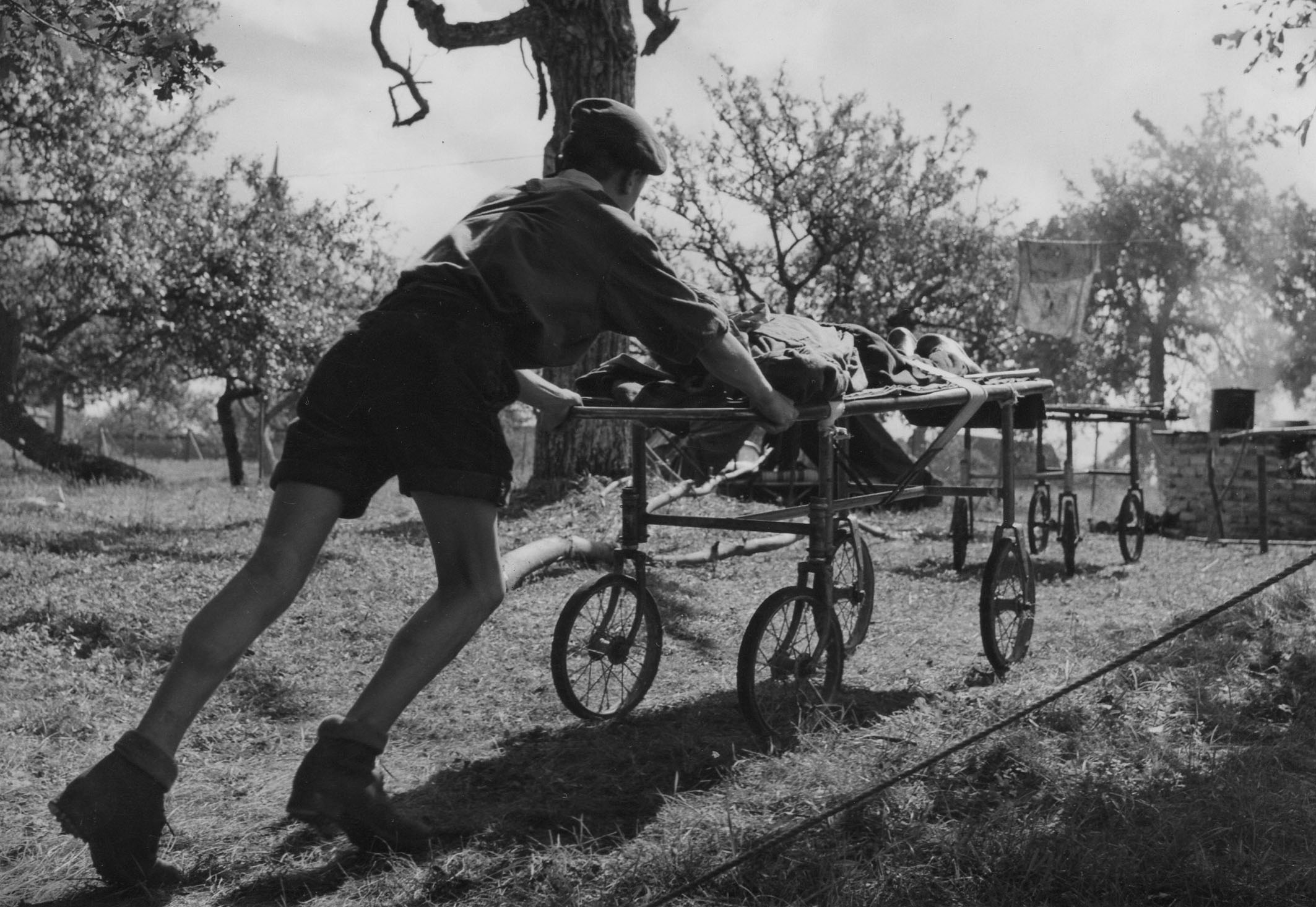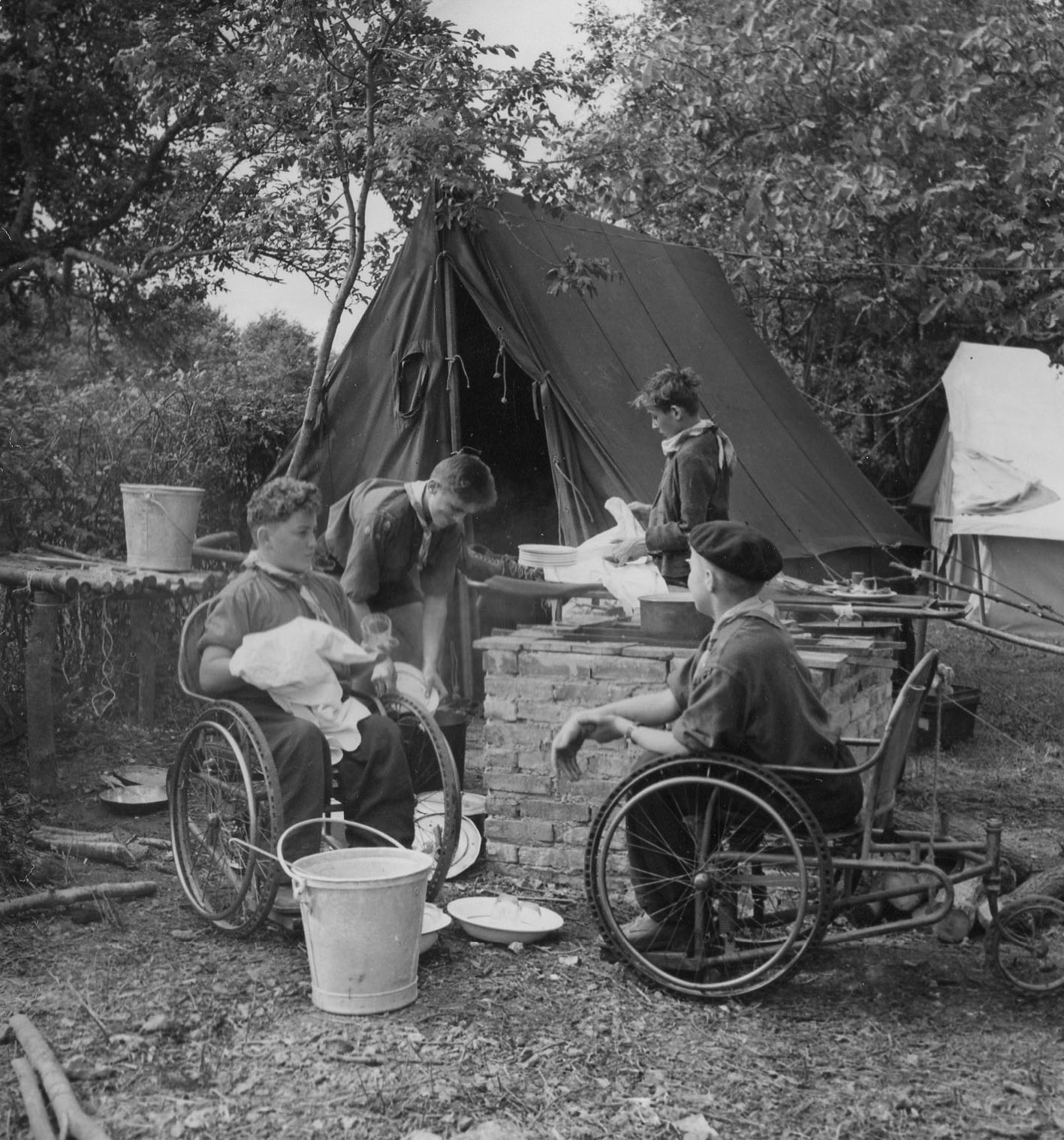 « Responsable d’une unité d’éclaireurs en rééducation de séquelles de poliomyélite à l’hôpital de Garches, tout content de diriger le premier camp proposé à notre unité, décidé à en faire un camp « comme les autres ». Nos garçons sont tout aussi mordus, malgré le handicap : un tiers en chariots plats, un tiers en fauteuils roulants, le reste « mobile » mais avec difficultés, corsets et fatigues.