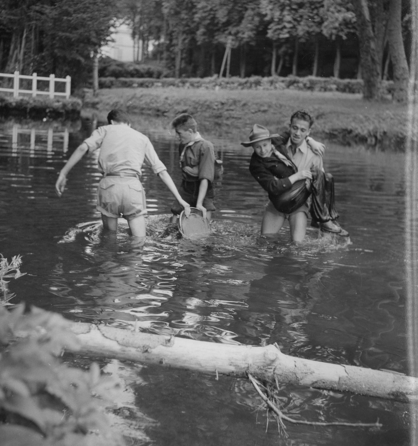 Eh oui : le gué n’y était plus, mais le photographe y était. (…) Il est intéressant de constater, à travers quelques séries d’instantanés, qu’un chariot plat peut sombrer très progressivement, avec beaucoup d’élégance, et qu’il n’est pas commode, en fauteuil roulant, de garder longtemps les jambes au sec. Cette initiative pédagogique a connu un énorme succès». (de dos, Y. Bastide)