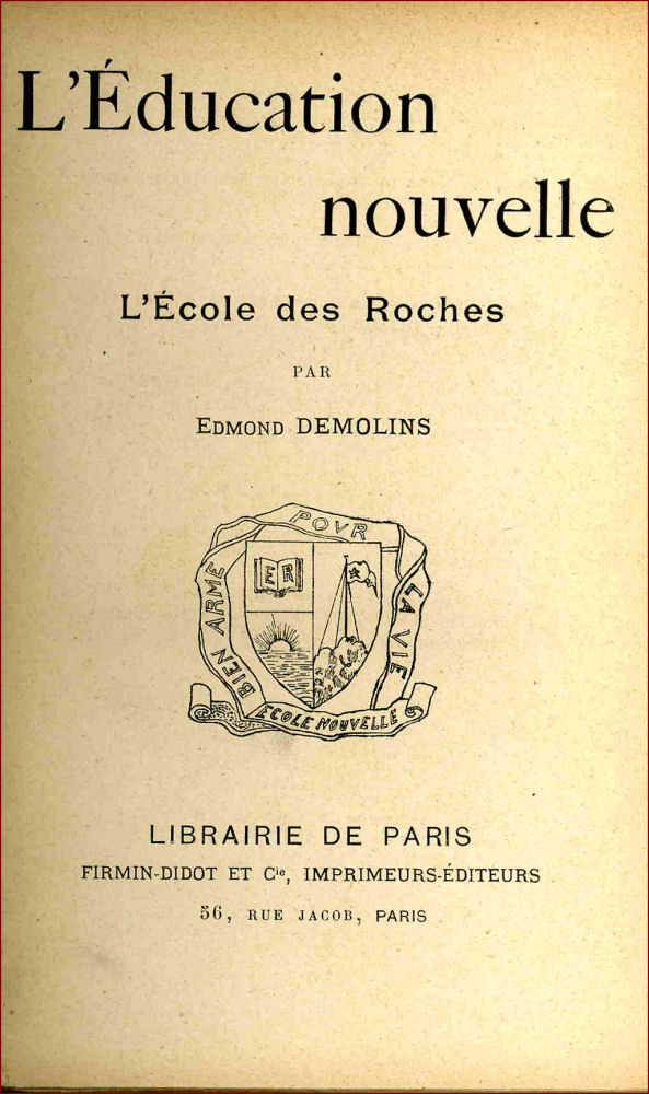 « L’École des Roches a été créée en 1899 à Verneuil sur Avre par Edmond Demolins, disciple de Le Play et marqué par le catholicisme social. Elle s’inscrit dans une démarche critique à l’égard du système éducatif français. En 1897, Demolins publie “ À quoi tient la supériorité des Anglo-saxons ? ” Il y affirme que “ la question sociale est une question d’éducation ” et que la supériorité des Britanniques, dans de nombreux domaines, tient à leurs méthodes éducatives. Son discours, jugé scandaleux à l’époque, est très critique à l’égard de l’éducation française, “ anti hygiénique ”, organisée en “ régime claustral ” qui “ fait des fonctionnaires ou des ratés ” alors que “ l’éducation anglaise fait des hommes ”. (…) »