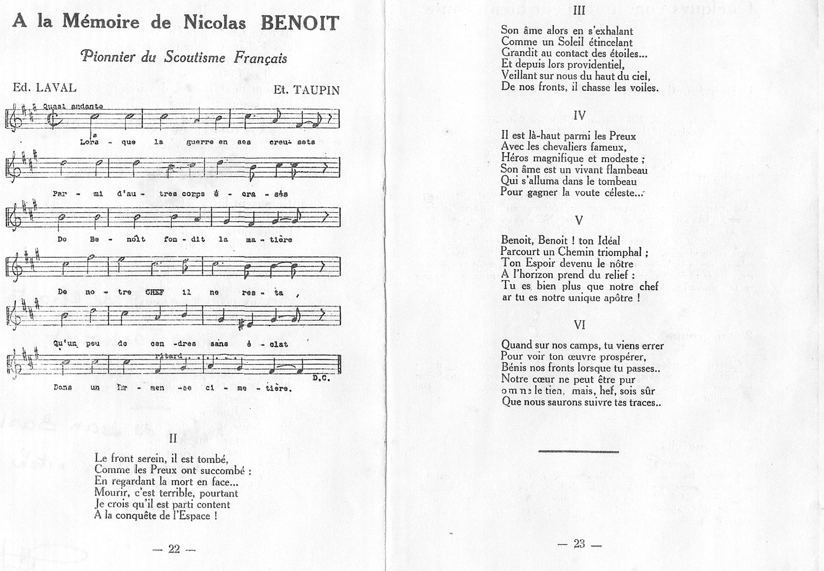 Peu de temps après la guerre, Laval et Taupin, également auteurs du « chant fédéral » des E.D.F., « Toujours tout droit », écrivent un chant à la mémoire de Nicolas Benoit :