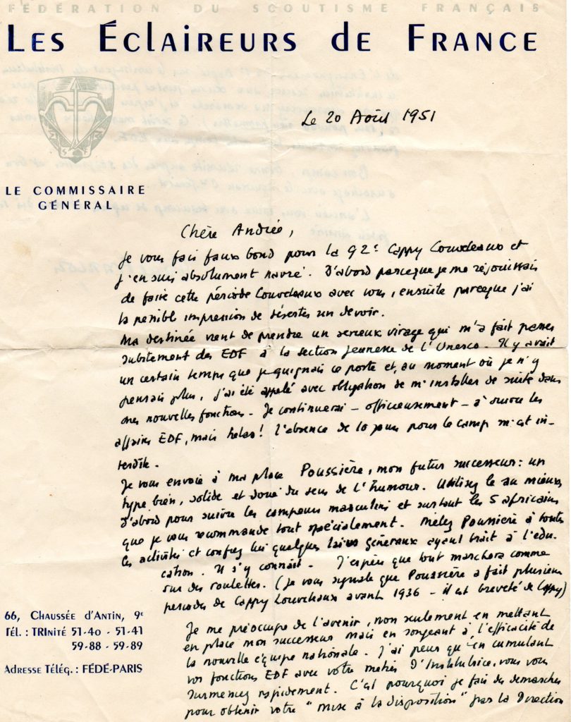 Andrée Mazeran-Barniaudy raconte, dans l’ouvrage « Cent ans de laïcité dans le scoutisme et l’éducation populaire », son arrivée à l’équipe nationale Louveteaux et l’évolution de la branche. Elle nous a confié deux lettres de Pierre François, alors Commissaire Général, au moment de sa nomination comme Commissaire Nationale.