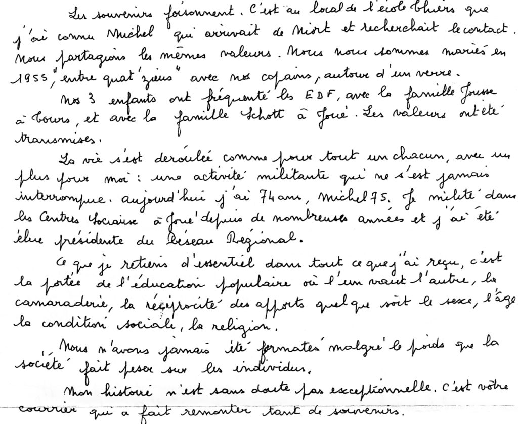 Quelques extraits d’une lettre reçue par Janine Chollet Vallée à la suite d’un contact avec une « ancienne »