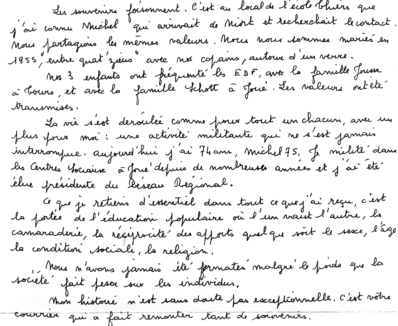 Quelques extraits d’une lettre reçue par Janine Chollet Vallée à la suite d’un contact avec une « ancienne »