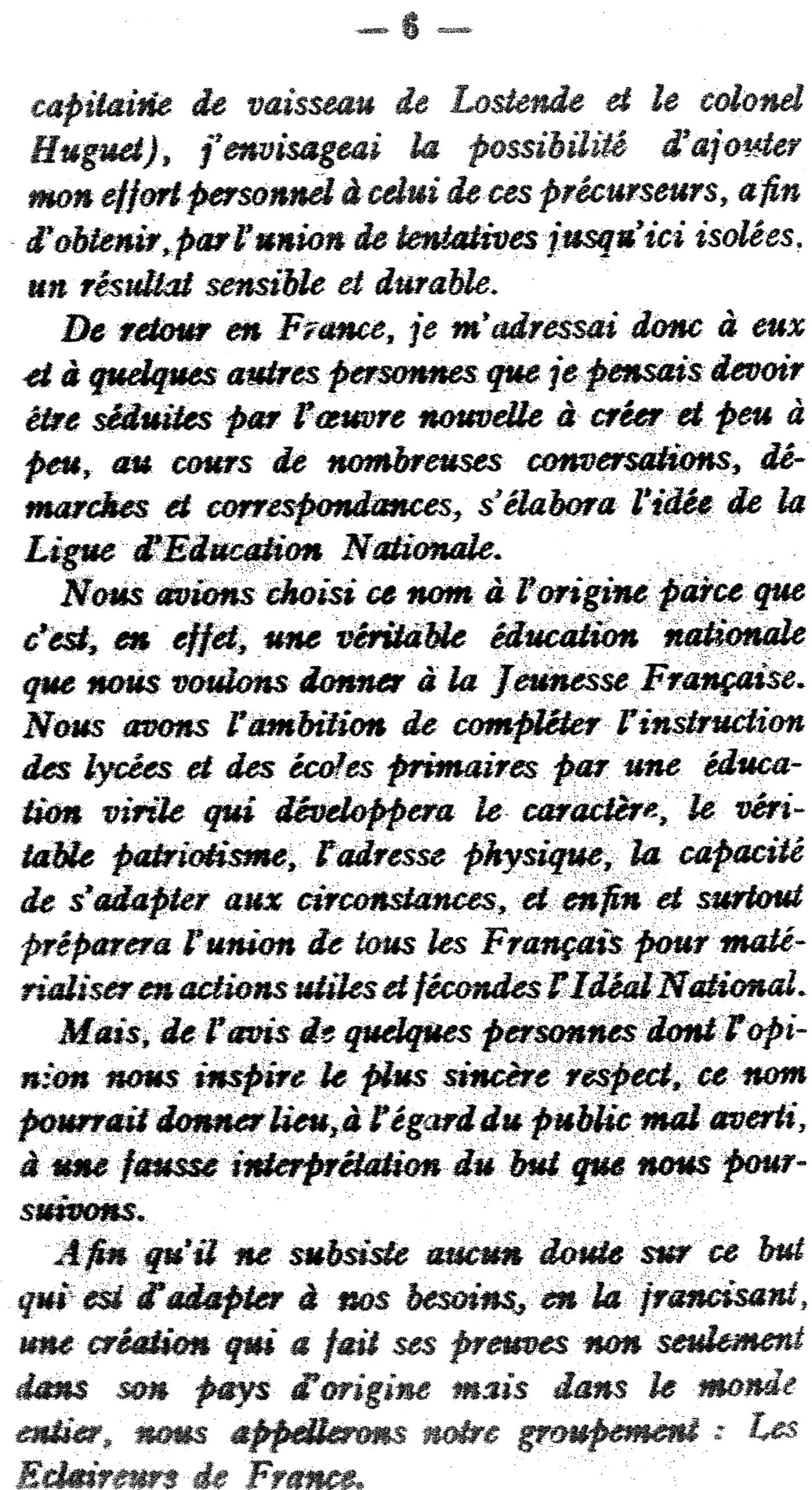 Quelques mois après, Nicolas Benoît va éditer un « plan d’organisation des troupes d’éclaireurs » dans lequel on trouve une allusion à la Ligue d’Éducation Nationale, mais aucune allusion à Coubertin ou aux « Éclaireurs Français », créés en octobre par ladite Ligue :