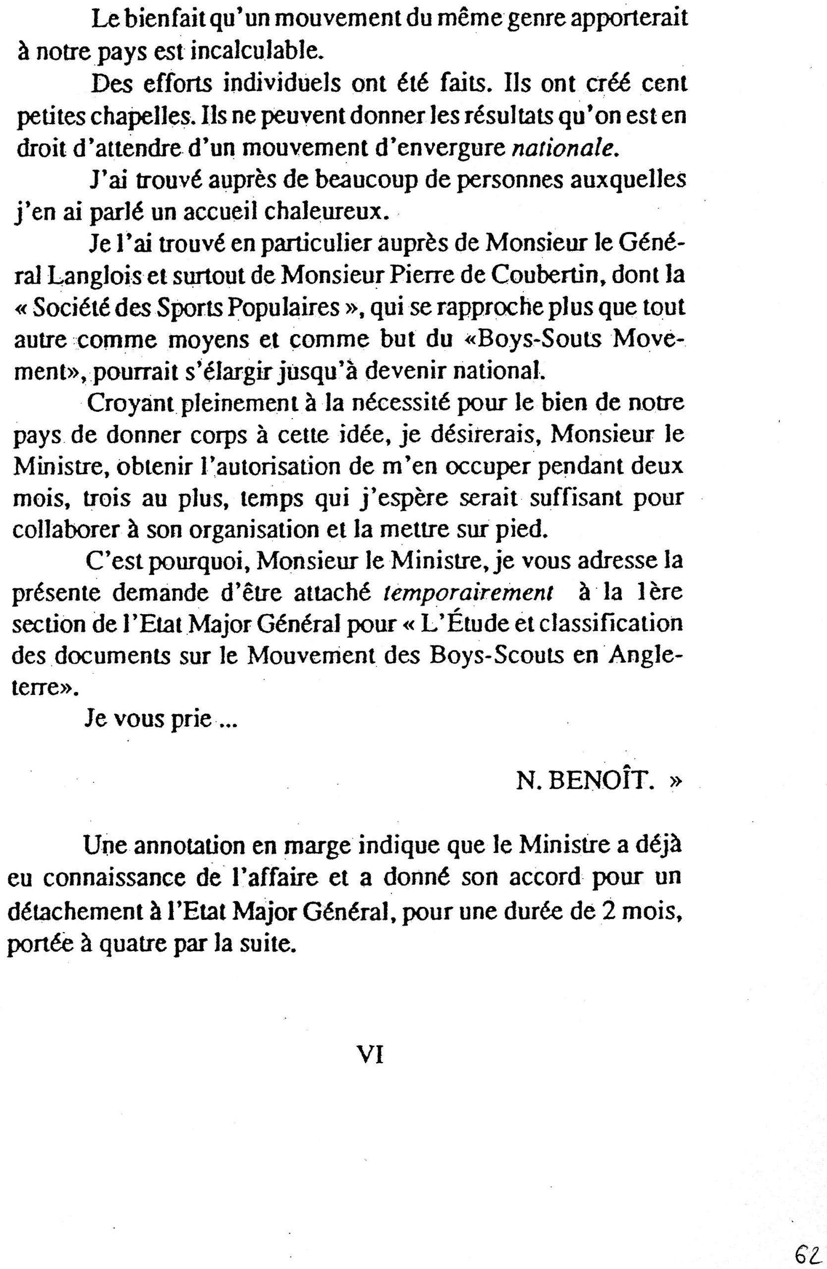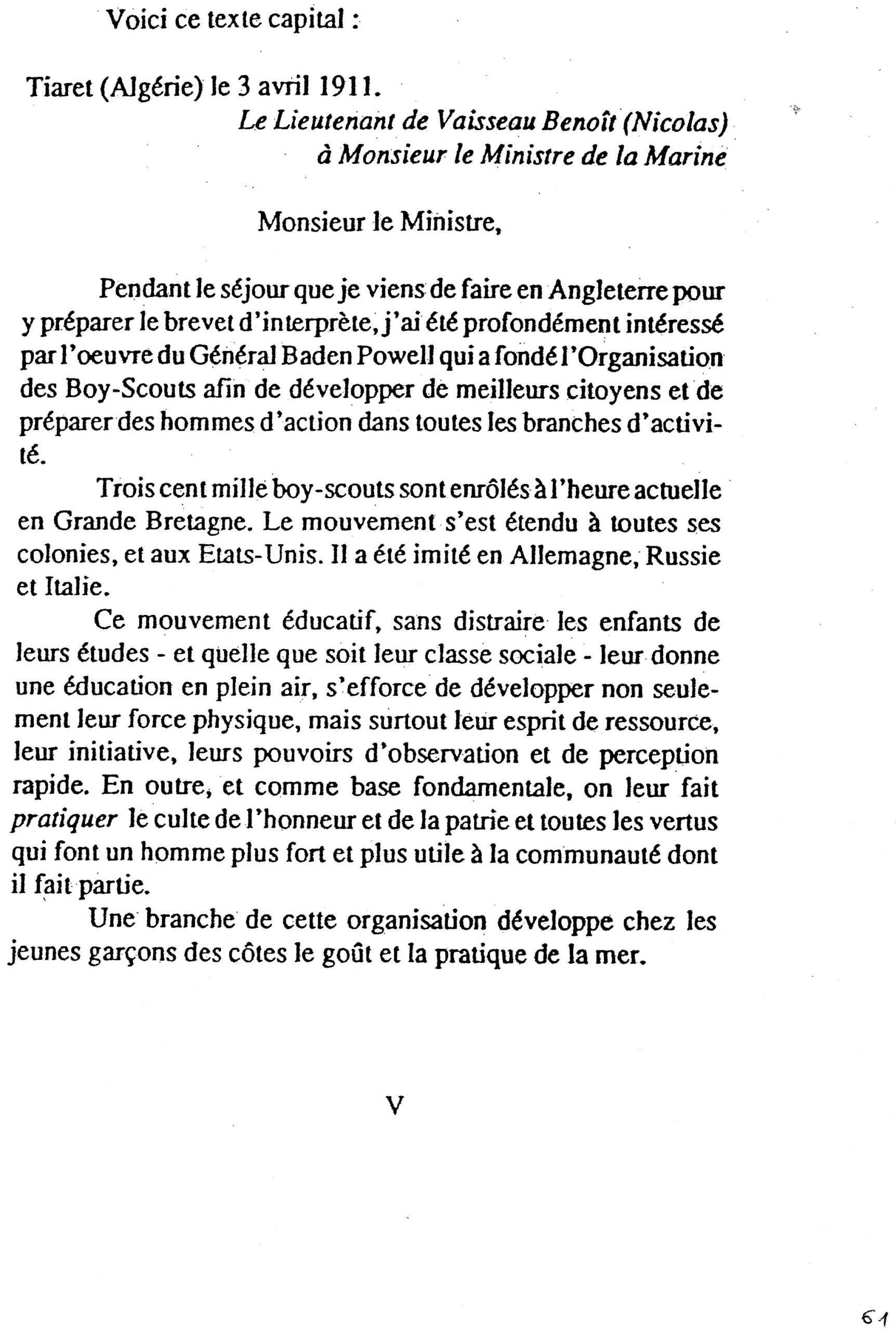 Avril 1911 : le Lieutenant de vaisseau Benoît écrit à son Ministre pour attirer son attention sur l’intérêt du scoutisme pour la formation des jeunes Français, et solliciter un détachement pour s’en occuper.