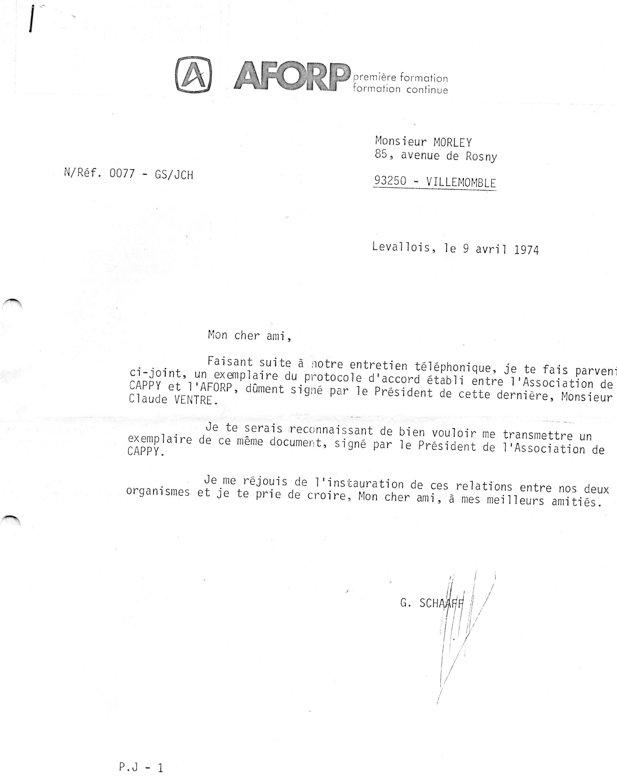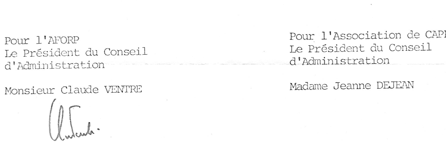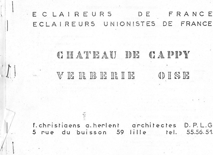 – les démarches ont été menées par Georges Schaff, ancien E.U., en relation avec Pierre Morley ; un protocole d’accord a effectivement été signé entre l’AFORP, association de formation dépendant de l’U.I.M.M., et l’association de Cappy alors présidée par Jeanne Déjean ; élaboré sur notre proposition et après… quelques réunions de travail, il entrait dans le détail des modalités de collaboration entre l’AFORP d’une part, qui devait installer à Cappy un centre d’accueil de jeunes apprentis, et les associations de scoutisme, d’autre part ;