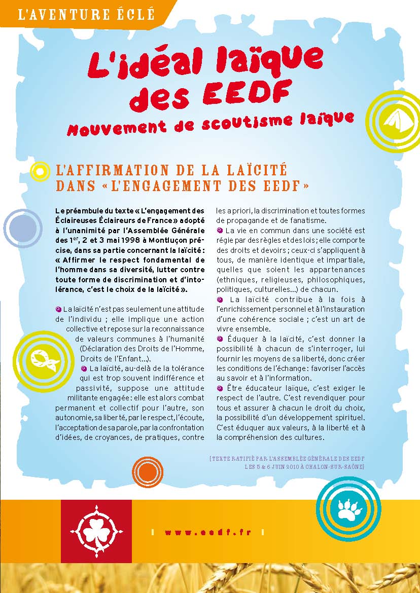 –  Encore : « En 1947, l’A.G. des E.D.F. tenue à Angoulême avance d’un pas dans l’intégration au système scolaire. » Rien ne justifie cette présentation : les « résolutions d’Angoulême » concernent l’introduction de la démocratie à la branche éclaireurs, ce qui est loin d’être le cas dans l’enseignement (voir les textes)… Il s’agit même, au contraire, de débarrasser notre scoutisme de son caractère trop « scolaire »… Le nouvel article 1 affirme certes  « laïque comme l’école publique » mais cela n’a rien d’une « intégration » !