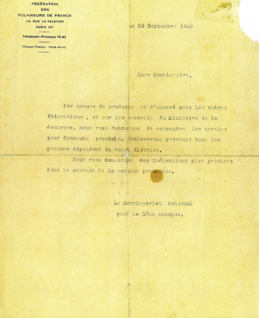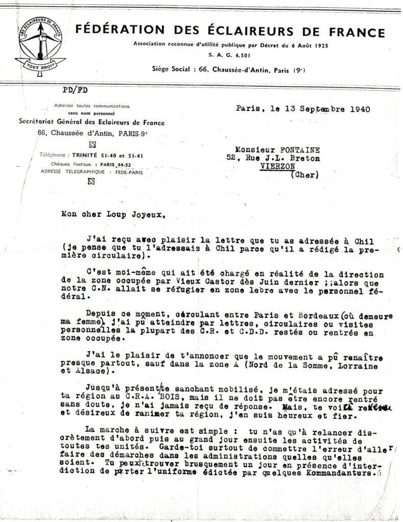 Extraits des très riches archives du groupes de Troyes regroupées par Guy Wilmes, les circulaires émises par Pierre Déjean à la rentrée de 1940.