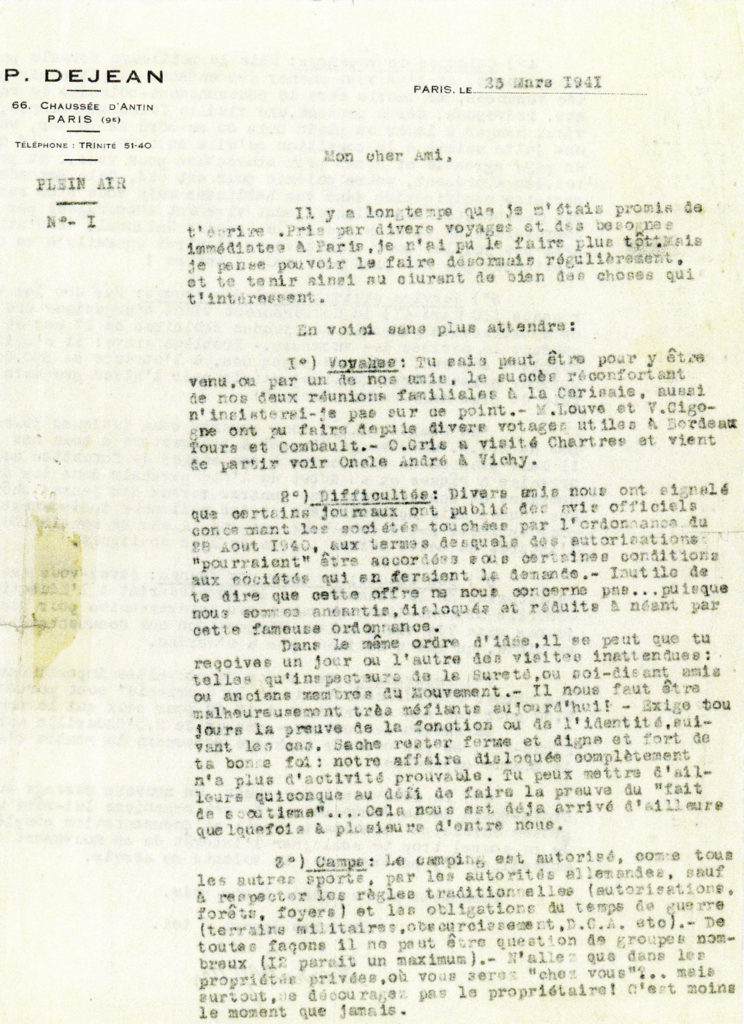 Une lettre de Pierre Déjean datée de mars 1941, intitulée « Plein Air n°1 » précise un certain nombre de points, en particulier en ce qui concerne les difficultés et les activités.