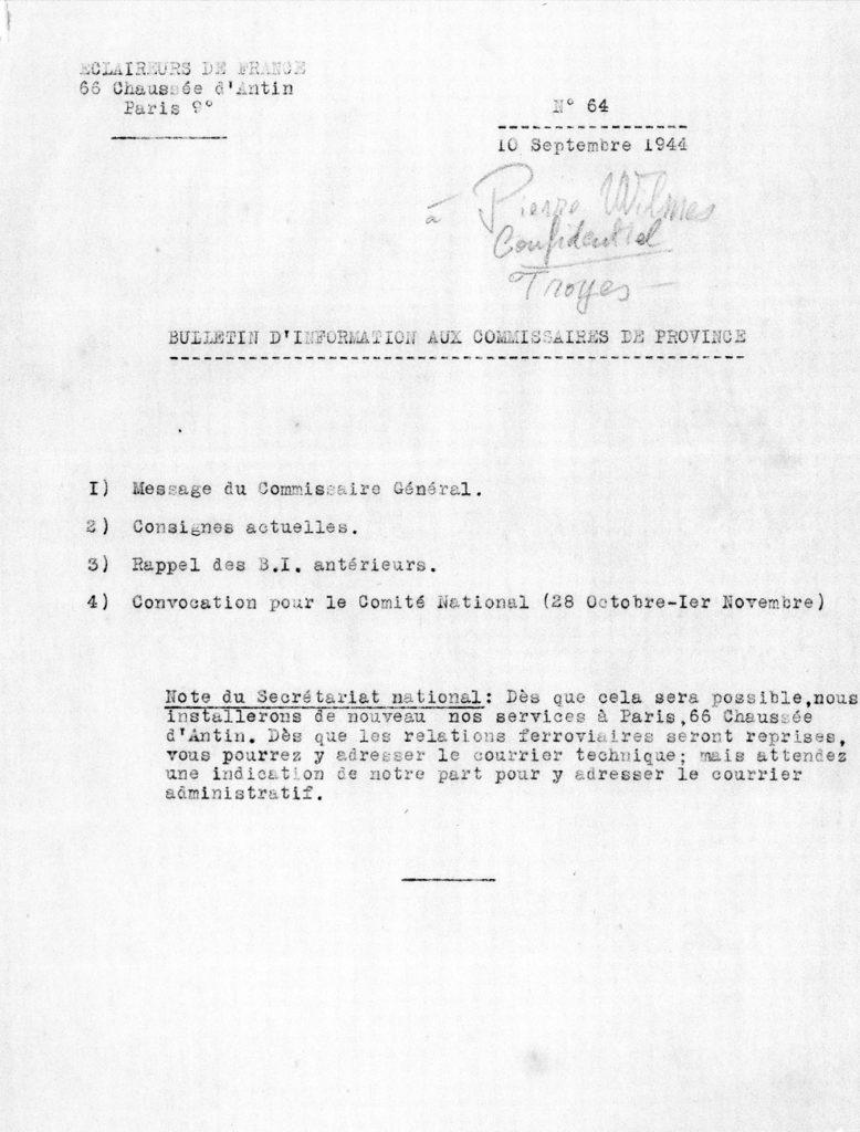 Le « bulletin d’information aux Commissaires de province » de septembre 1944, retrouvé par Guy Wilmes dans les archives du groupe de Troyes, donne une excellente idée des conditions du redémarrage du mouvement à la rentrée scolaire de 1944.