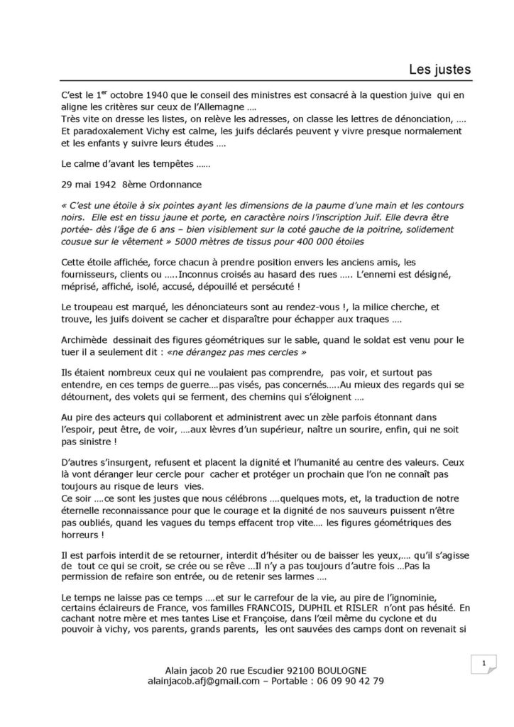 Nous avons repris ci-après le texte du discours qu’Alain Jacob, fils d’Annette Dennery, a prononcé à l’occasion de la remise de la Médaille des Justes aux familles Duphil et François, ainsi que le message adressé par Maurice Déjean