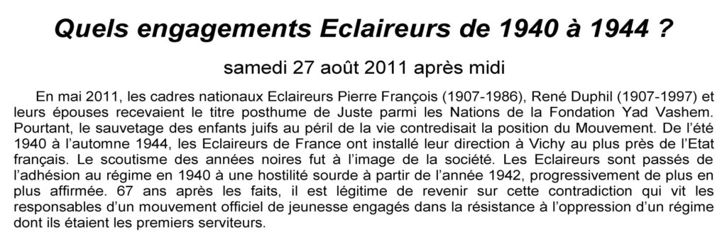 Que peut-on dire exactement – et transmettre aux historiens qui auront à en traiter – du comportement de notre scoutisme laïque pendant la période de l’État Français ? Le problème s’est posé en cet été 2011…