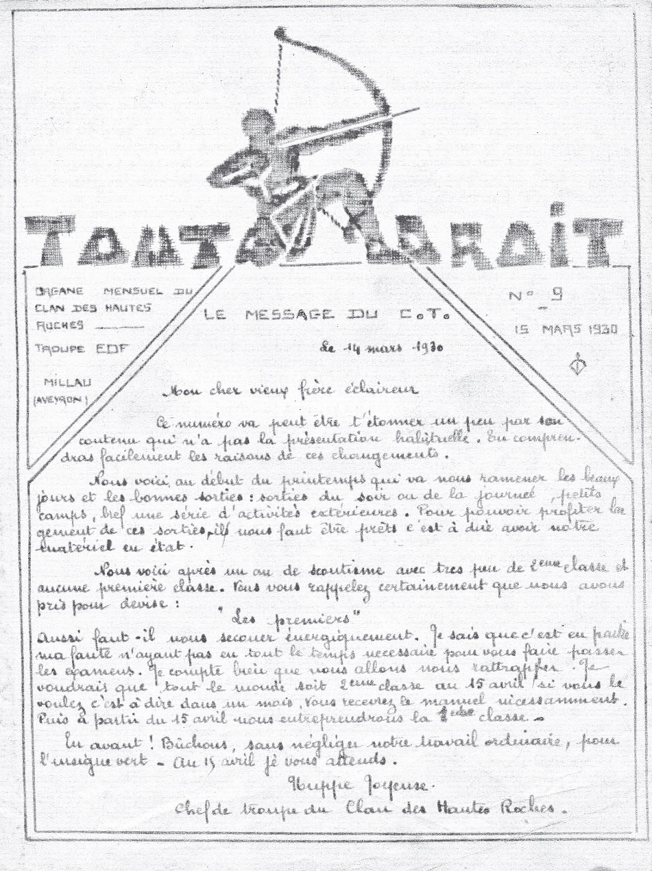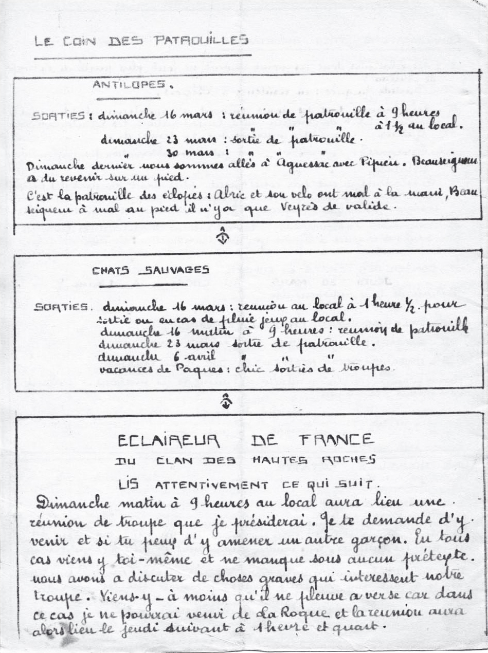 Dans les années 30, Jean Bireben « Huppe Joyeuse », chef de clan E.D.F., éditait, à l’intention des membres du groupe de Millau, un petit bulletin manuscrit dont Philippe Bernat a retrouvé quelques exemplaires.