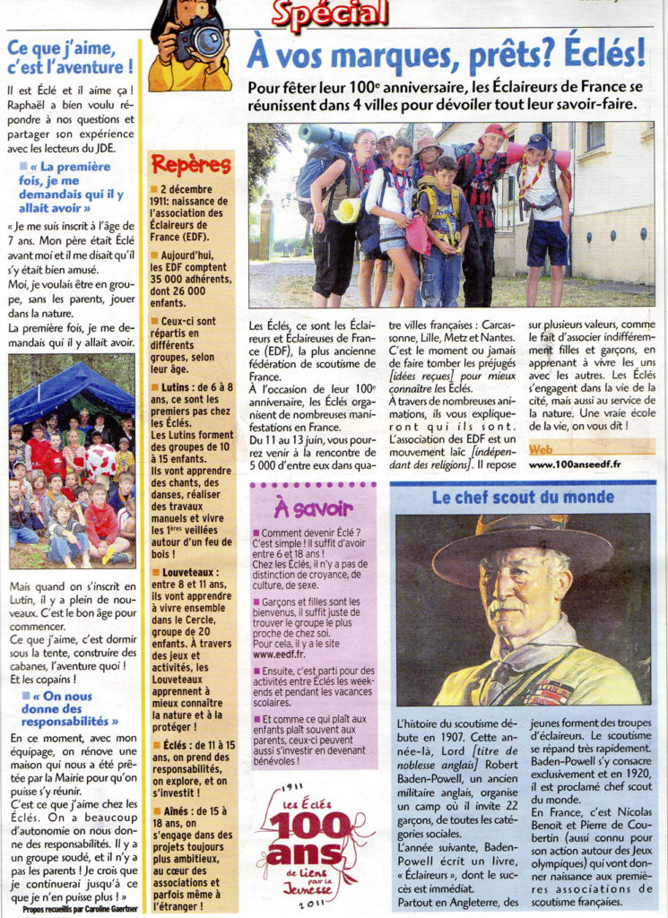 2011 : Le Journal des Enfants présente le Mouvement et son centenaire dans son numéro du 2 juin dernier. Un bon résumé, qui n’a pas oublié B.P. !