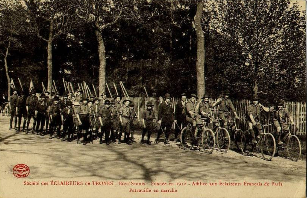 « Au printemps 1911, le scoutisme troyen est piloté par un militaire, le capitaine Brunet, officier au 1er bataillon de chasseurs à pieds. Une trentaine de jeunes garçons vont lancer le Mouvement sous le nom de “ Boys-scouts Troyens ”. Le local est installé au domicile même du capitaine ; le groupe adhère aussitôt à la Ligue d’Éducation Nationale de Pierre de Coubertin et prend le nom de “ groupe local de Troyes des Éclaireurs Français ”. La fédération nationale n’existant pas encore, il fonctionnera de façon indépendante jusqu’en 1914 où la troupe rejoindra les Éclaireurs de France.