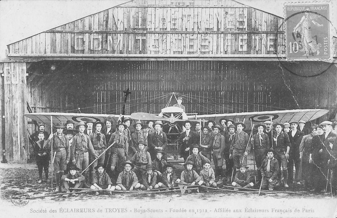 « J’ai trouvé cette photo dans mes dossiers : les éclaireurs de Troyes, affiliés aux Éclaireurs Français devant un avion militaire. La carte postale est datée du 23 juillet 1914. L’auteur écrit “ Je vous envoie aujourd’hui une carte du premier groupe de la section troyenne des Éclaireurs de France. Vous m’y trouverez. ” »