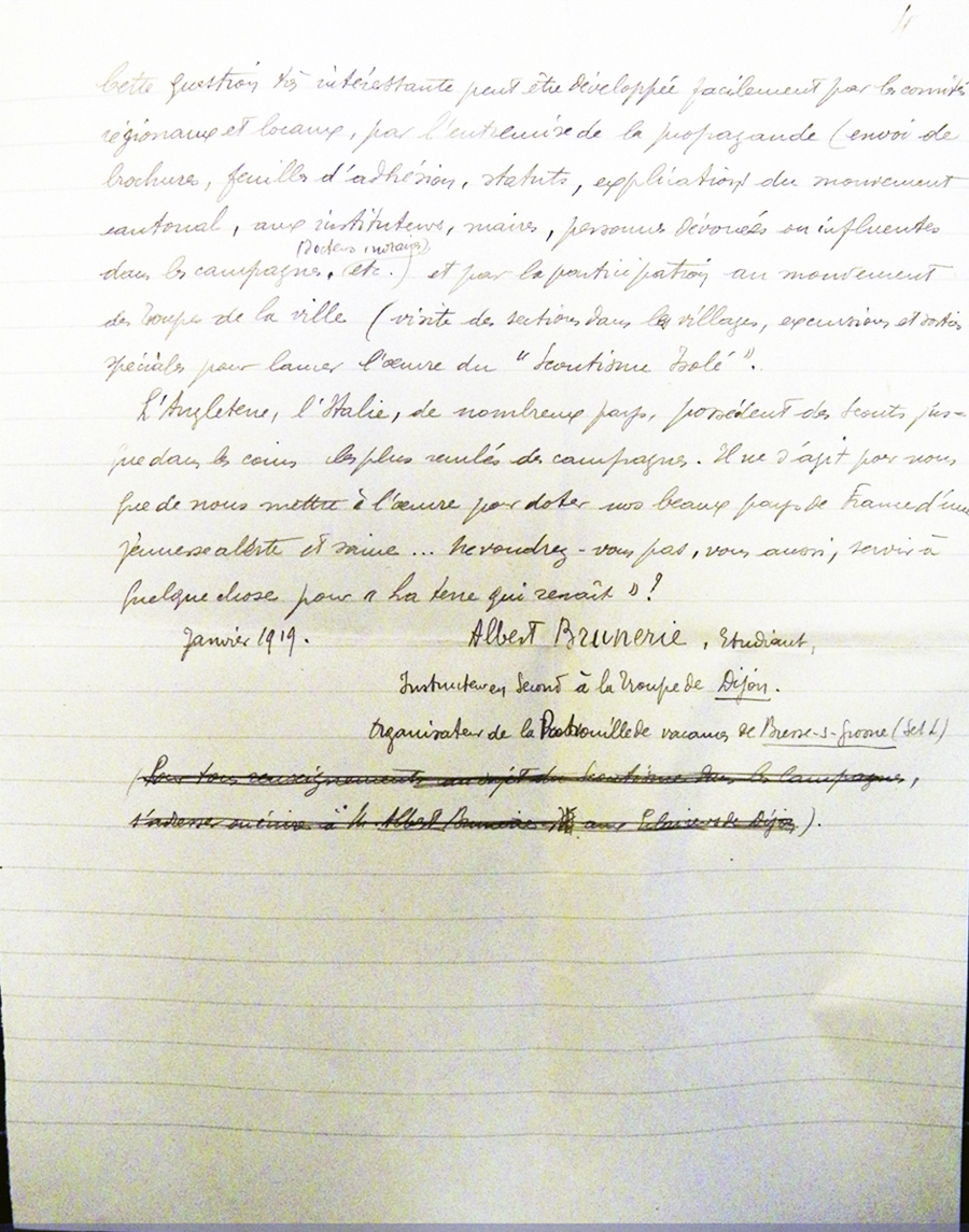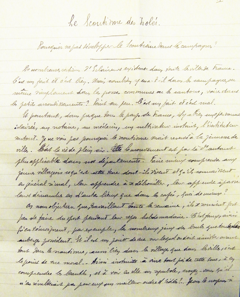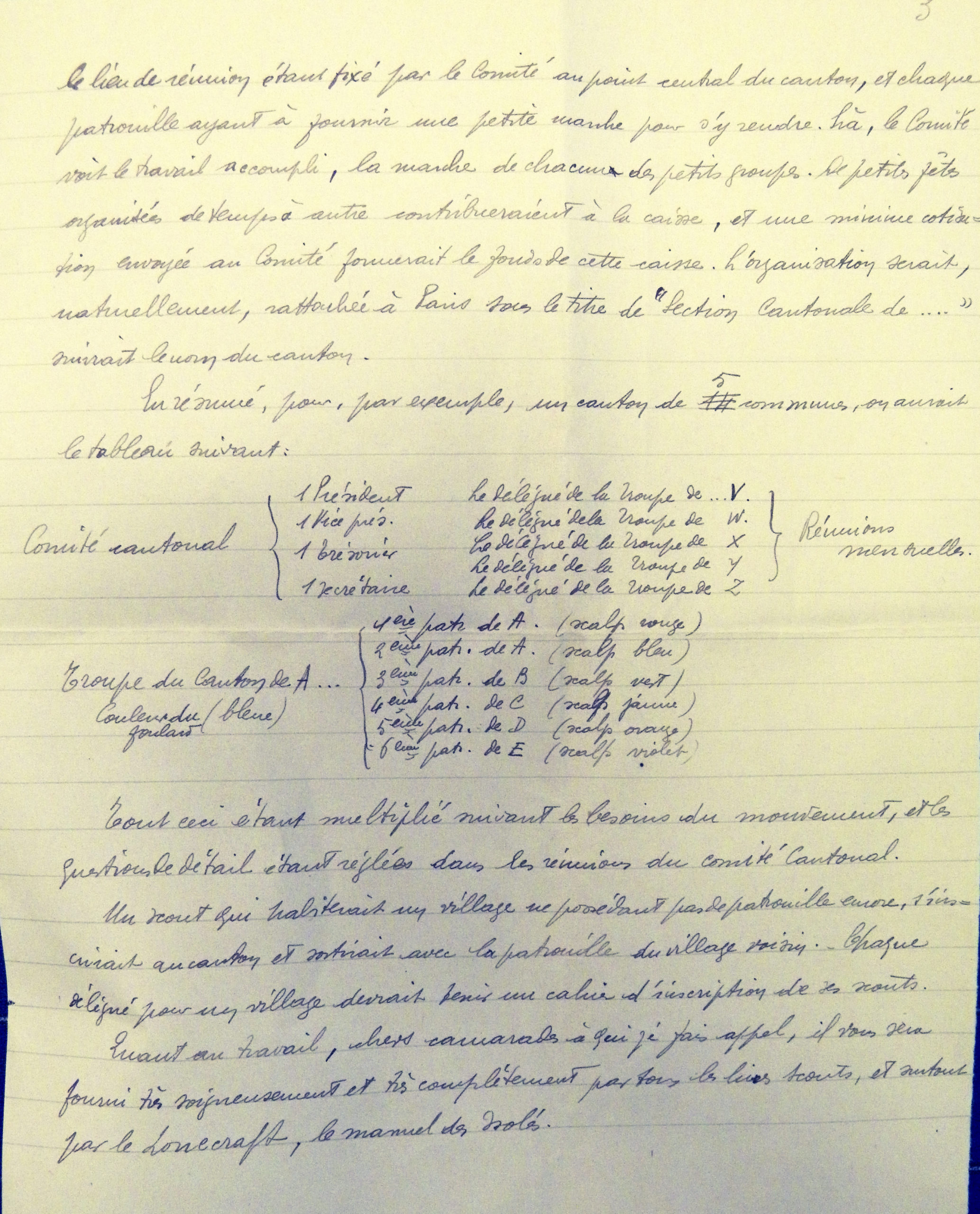 Le problème du recrutement en dehors des villes et des bourgs est d’ailleurs évoqué par un texte de 1919, écrit par un étudiant « instructeur de scoutisme » organisateur d’une « patrouille de vacances » que l’on peut considérer comme une ancêtre des « patrouilles libres » : « Il y aurait de noble travail à faire dans cet ordre d’idée »… Ce document est très intéressant parce qu’il pose en termes très concret le problème du recrutement en milieu « rural », dans une époque où une grande partie de la population habitait encore des villages, ainsi que celui de l’organisation du Mouvement en « sections cantonales » :