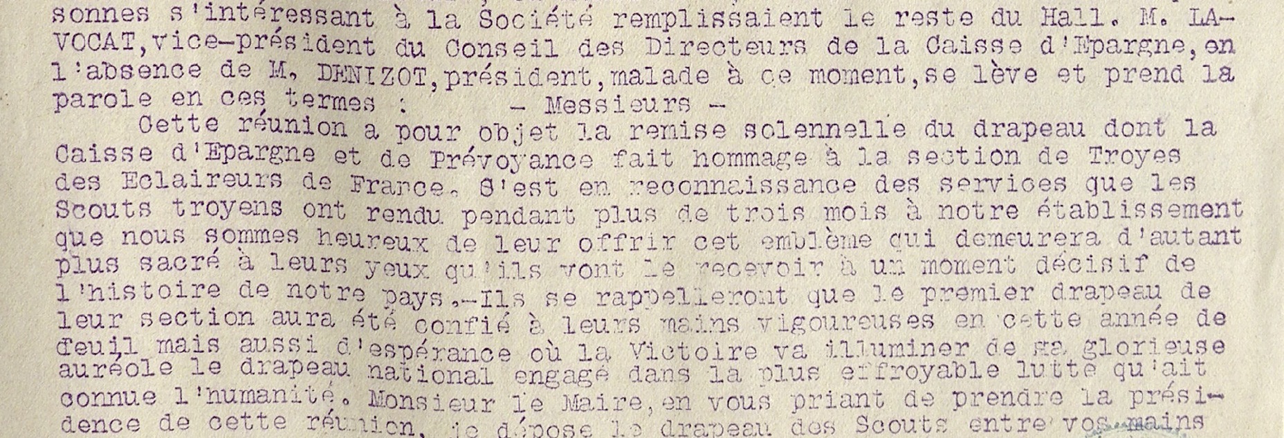 Le numéro suivant rend compte de la cérémonie de remise d’un drapeau, offert par la Caisse d’Épargne, en présence du maire de Troyes, avec plusieurs discours insistant sur le rôle du scoutisme dans cette période historique :