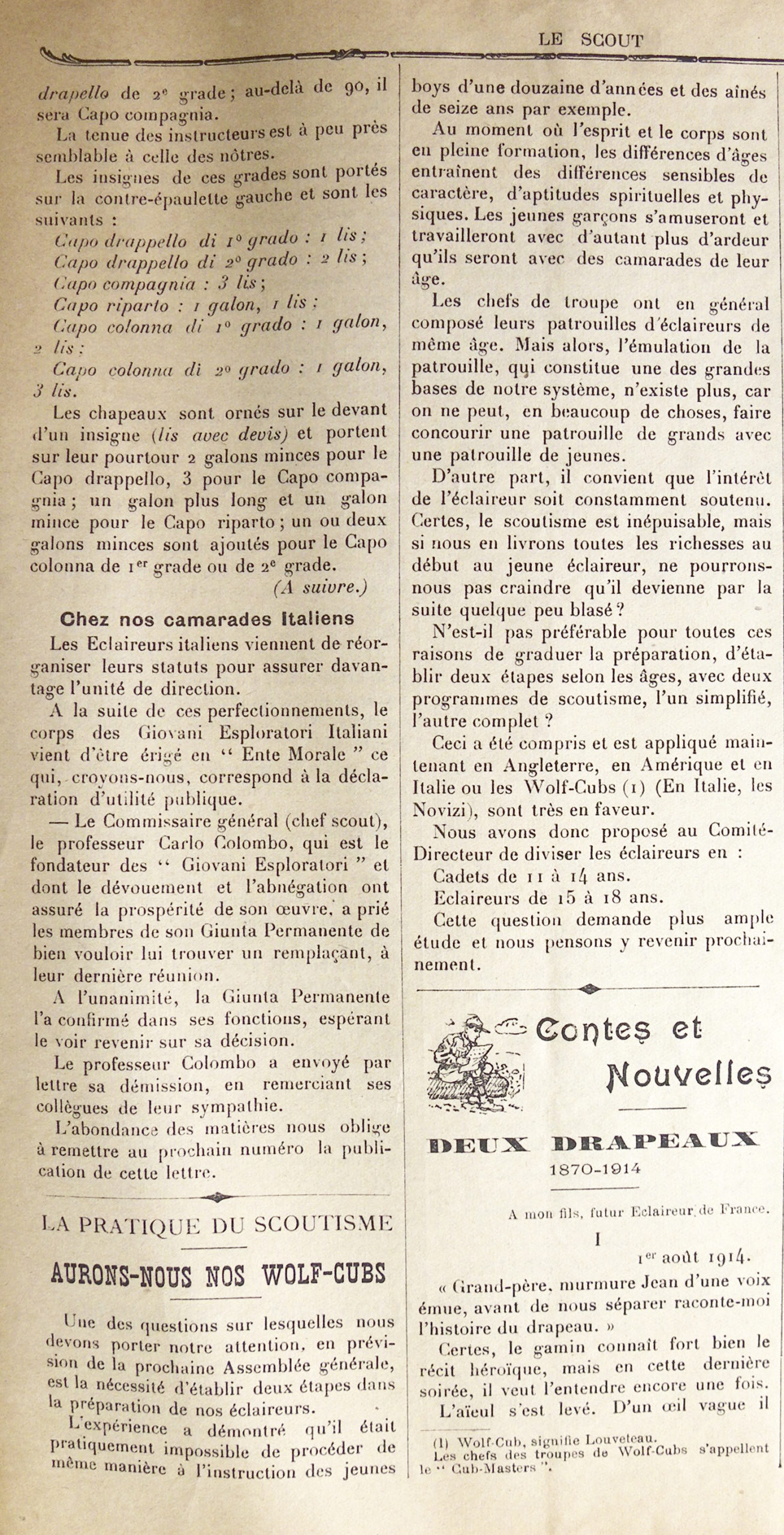 Il est d’ailleurs curieux de constater que cette proposition semble conduire à la mise en place de « patronages ». Et l’article affirme : « cette nouvelle oeuvre est peut-être mitoyenne du scoutisme, mais n’en fait pas partie intégrante ». Dans l’esprit du rédacteur, le scoutisme semble se limiter à la branche « éclaireurs » qu’il conviendrait d’articuler en deux pour faciliter « l’instruction » des éclaireurs -; un article précédent, intitulé « Aurons-nous nos Wolf Cubs ? », utilise effectivement ce terme dans un sens impropre, mais pose bien le problème de cette articulation :