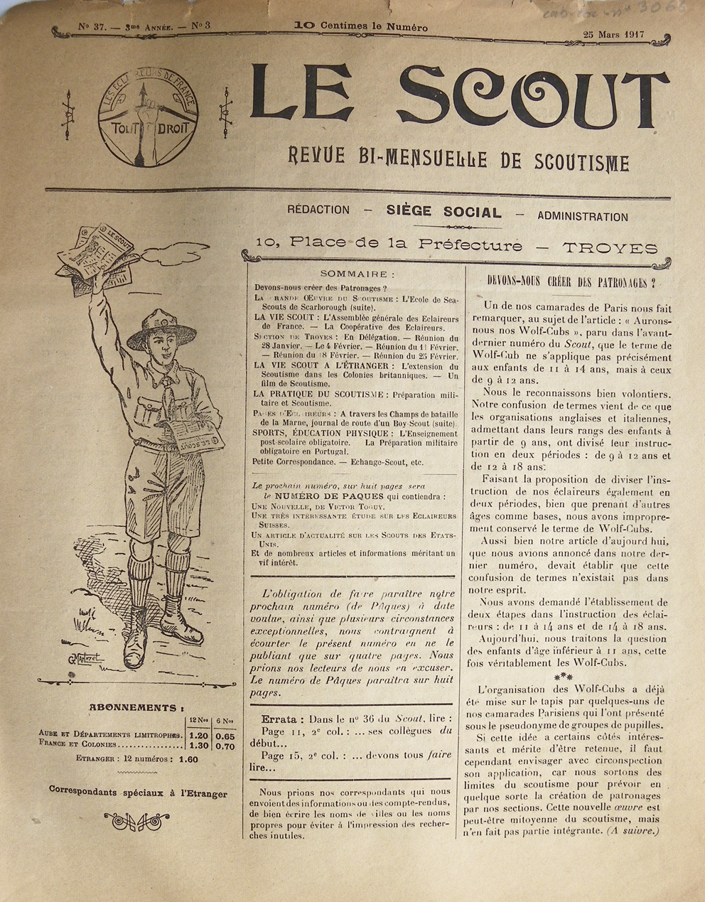 Rappelons que, l’année précédente, était posée la question d’une organisation « régionale » de l’association. Le numéro de mars 1917 fait suite à l’un des précédents sur ce nouveau sujet, qui va concerner à la fois les activités existantes et une éventuelle ouverture à de plus jeunes garçons :