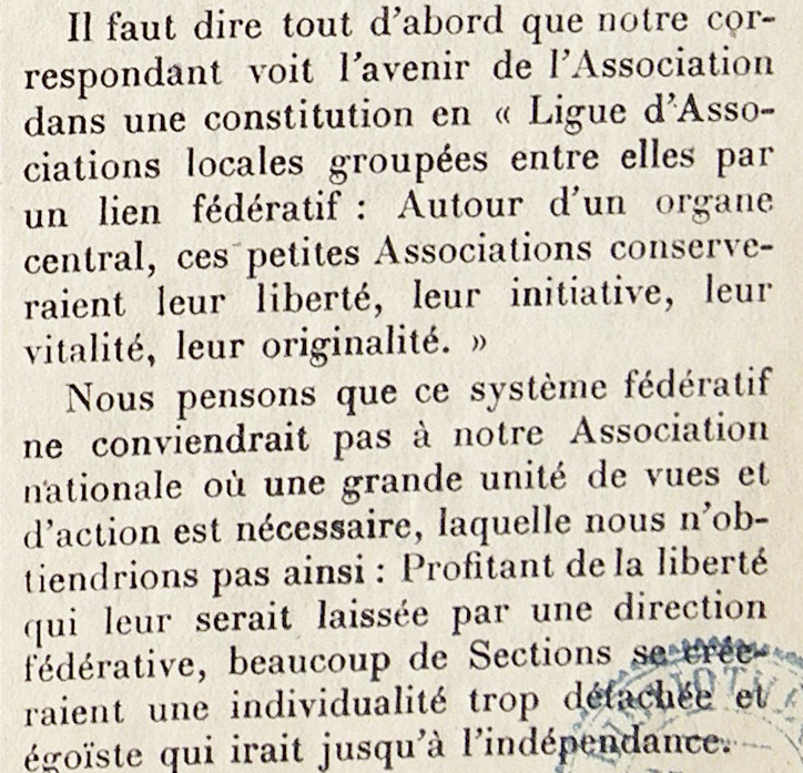 Cette proposition va entraîner un certain nombre de réactions qui occupent plusieurs numéros de 1916, avec quelques discussions à la clé : l’idée d’une « fédération » ne plaît pas trop au responsable troyen, qui y voit le risque d’une « individualité trop détachée et égoïste qui irait jusqu’à l’indépendance ». Cette organisation régionale ne doit pas faire obstacle à des contrôles menés par des « inspecteurs ». Au total, le problème est moins simple qu’il ne semblait au départ :