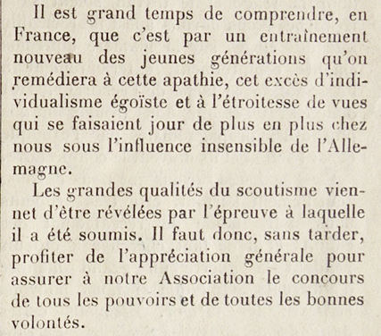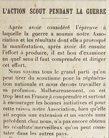 On commence à évoquer le scoutisme en Chine et… en Ouganda avec une appréciation : «Les Nkoli sont d’une très belle race : leur taille moyenne est de deux mètres ». Un numéro de mai évoque « L’action scout pendant la guerre » et met en évidence les difficultés rencontrées en France où le scoutisme est moins aidé qu’ailleurs : « en Italie, les « Giovani Esploratori » ont été fondés sous les auspices du roi et des ministres ; S.A.R. le Duc des Abruzzes et président général et le jeune prince héréditaire, Umberto, est le premier boy-scout d’Italie » :