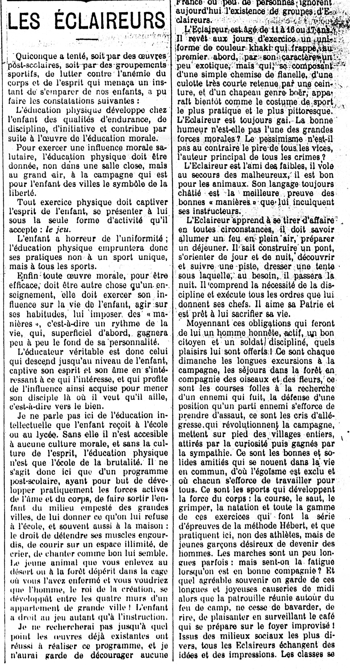 Le rôle du scoutisme en complément de ce qui existe, l’importance de la formation physique mais aussi du jeu, l’objectif d’un accompagnement vers « le bien », mais aussi les âges, la tenue, les activités, tout ce qui va permettre de faire de lui « un homme honnête, actif, un bon citoyen et un soldat discipliné ».