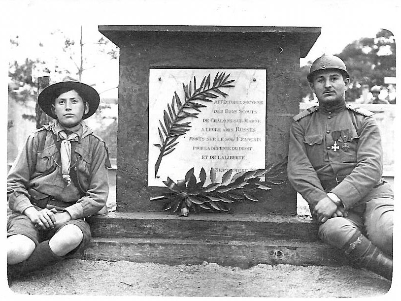 « L’intérêt du Scout de Troyes pour les russes n’est-il pas aussi lié à la présence des soldats russes pas loin de là, à Chalons sur Marne : voir photos jointe d’un éclé et d’un soldat russe décoré notamment de la croix de guerre française au printemps 1916 à Auberive près de Chalons sur Marne :