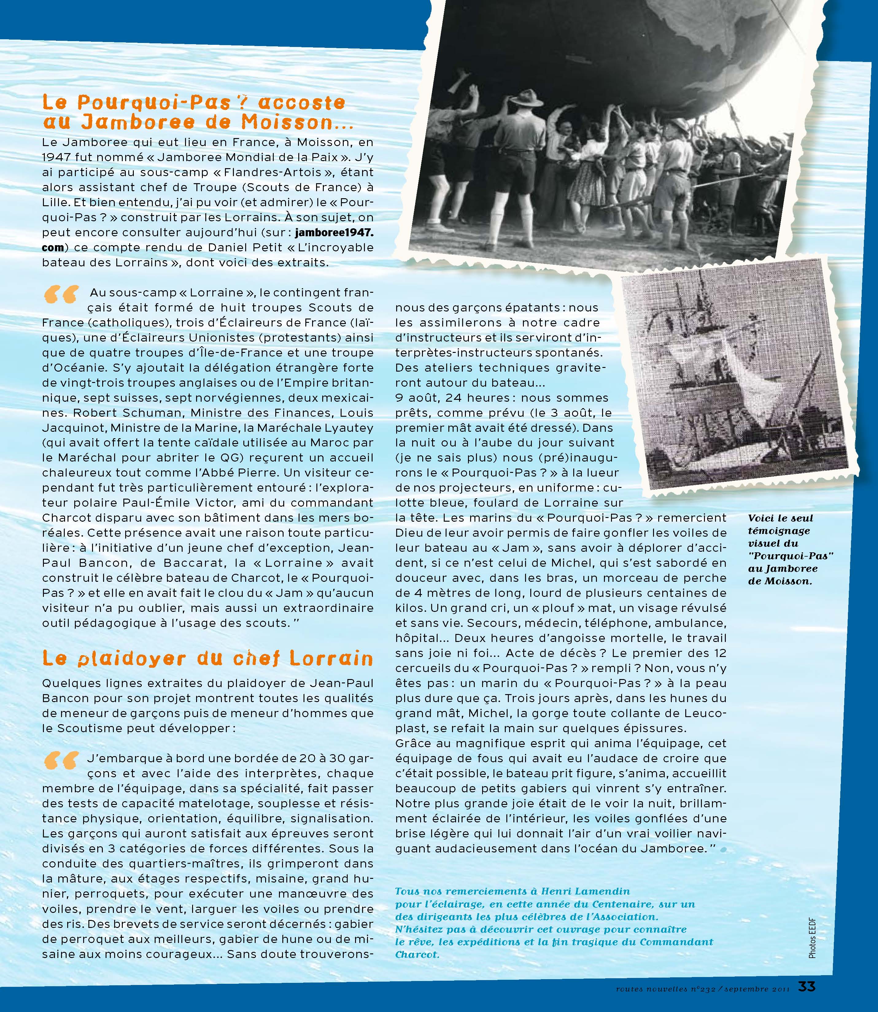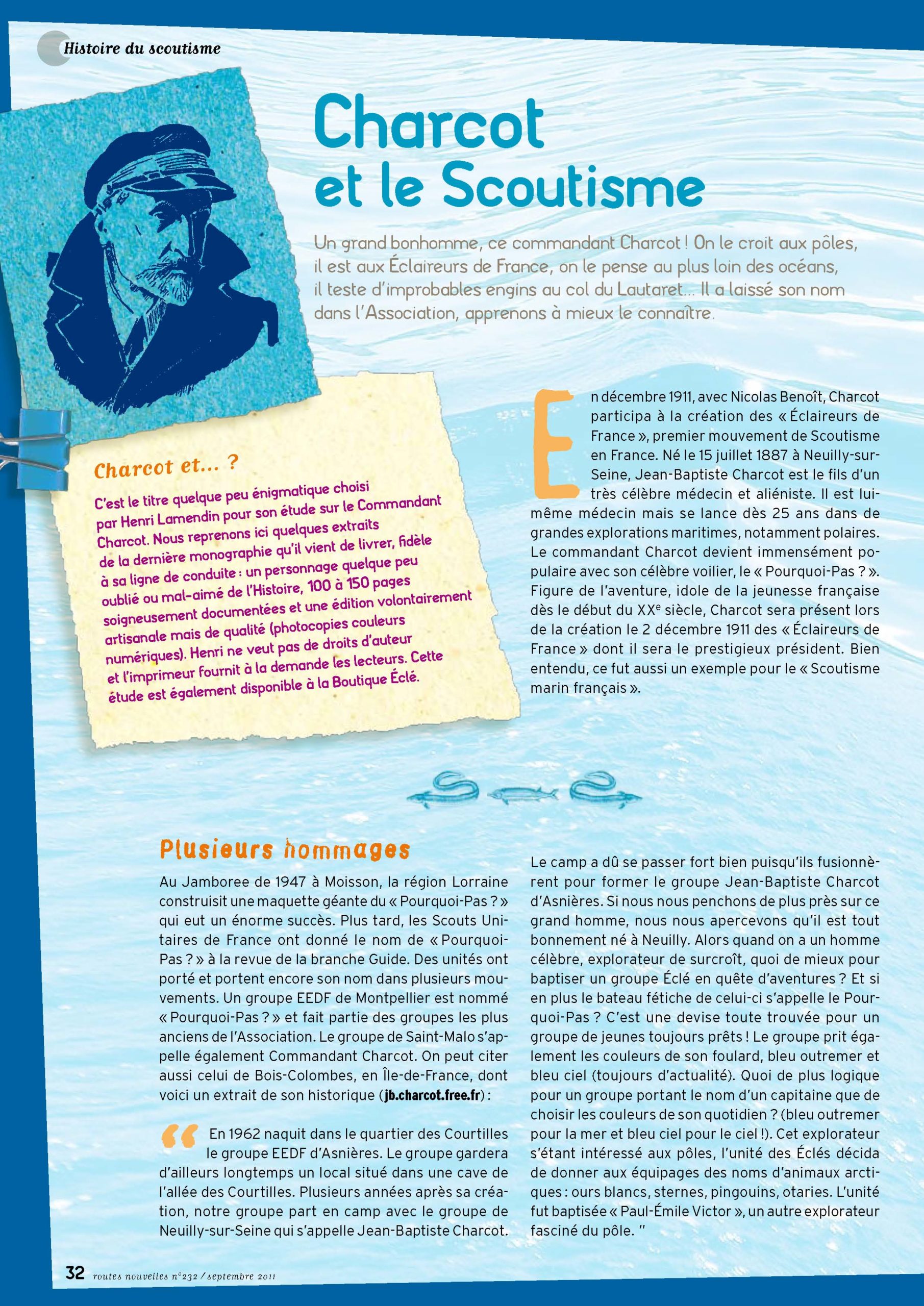 « Routes Nouvelles » de novembre 2011 évoque le premier président des Éclaireurs de France et son célèbre voilier le « Pourquoi Pas ? »
