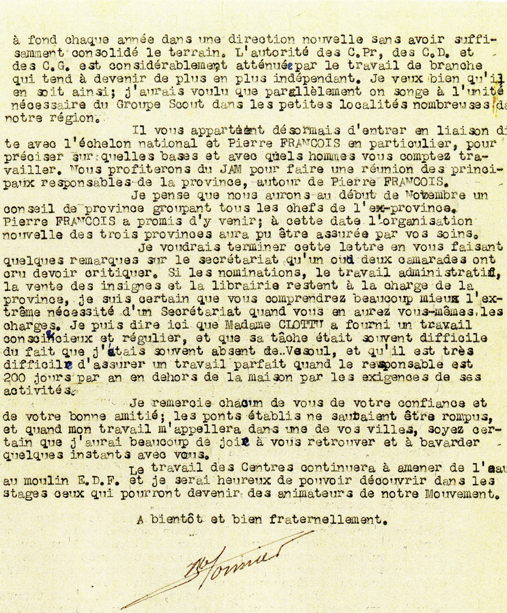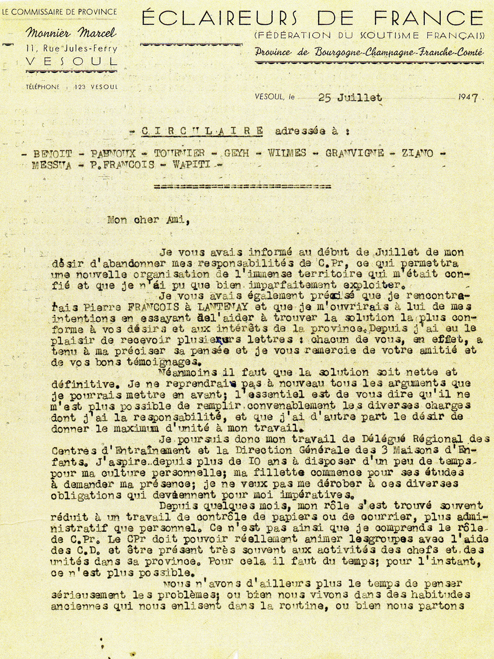 La lettre ci-après, écrite en 1947,  est une lettre de démission qui donne d’excellentes raisons à cette décision pour son auteur, alors Commissaire de Province. Celui-ci est, également, délégué des CEMEA, directeur de trois maisons d’enfants… et père de famille. Mais sa lettre pose aussi un problème de répartition des responsabilités entre les divers échelons du Mouvement : on y trouve le regret de voir certains adultes limités à des tâches « administratives », l’animation étant de plus en plus du ressort des branches.