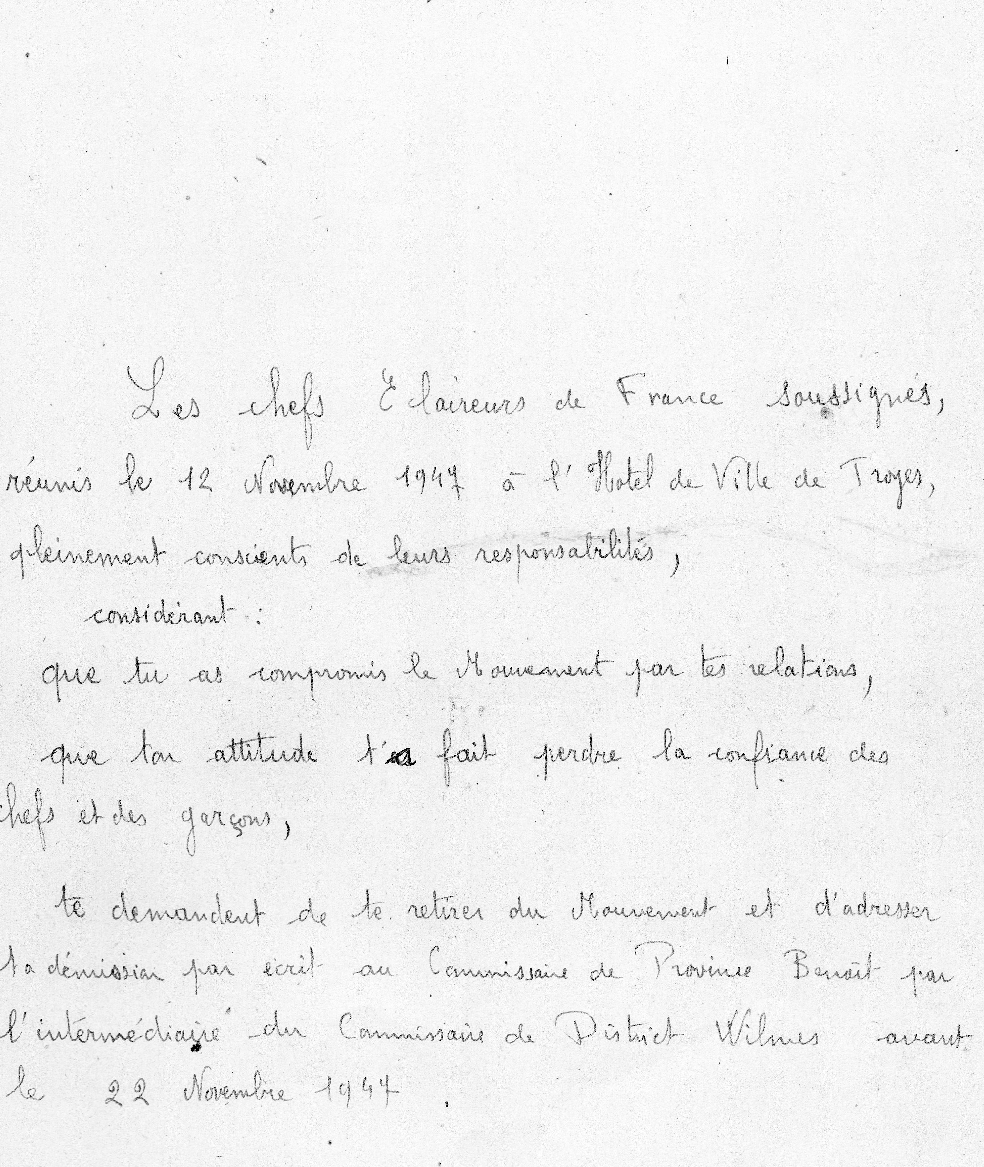 Il est bien précisé, avant signature par tous les chefs réunis : « Les chefs t’assurent qu’ils séparent totalement la question responsabilité devant le Mouvement de la question personnelle et qu’en toutes circonstances leur attitude restera inchangée ».