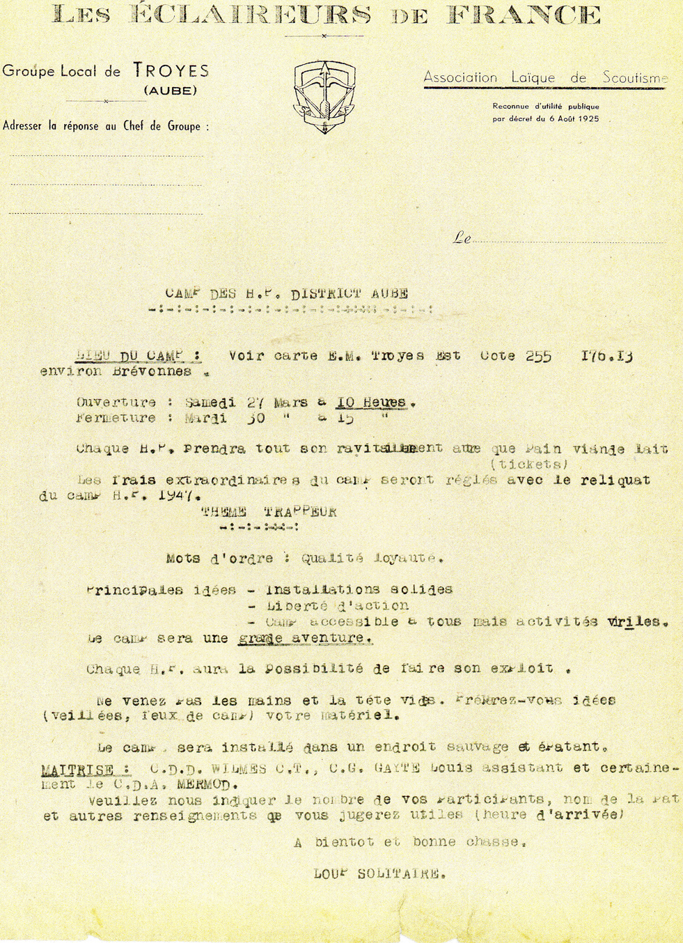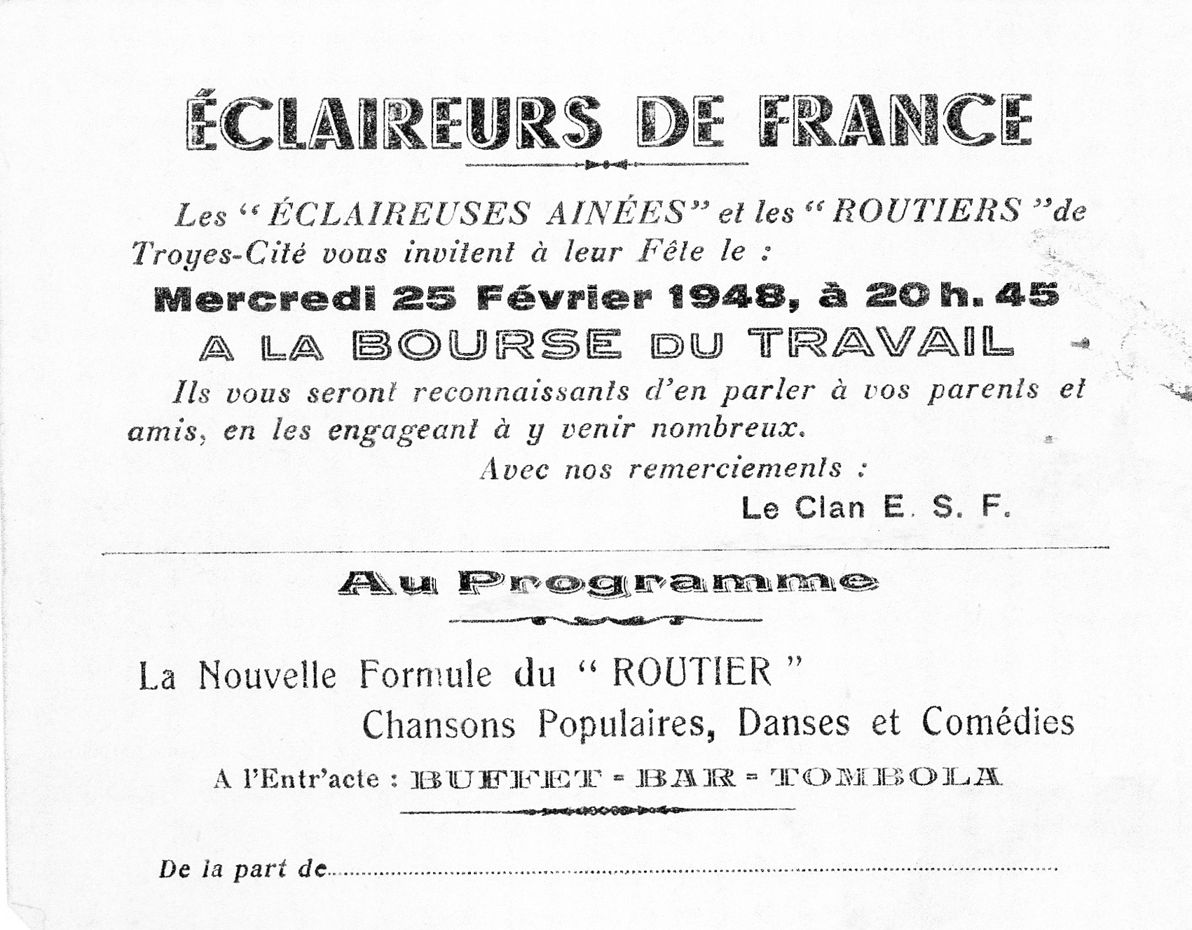 Toujours en 1948, une fête est organisée par les « éclaireuses aînées » – dont il est question pour la première fois – et les routiers sur invitation du « clan E.S.F. ». L’en-tête reste « Éclaireurs de France » :