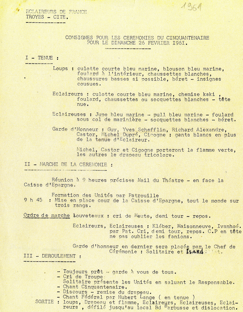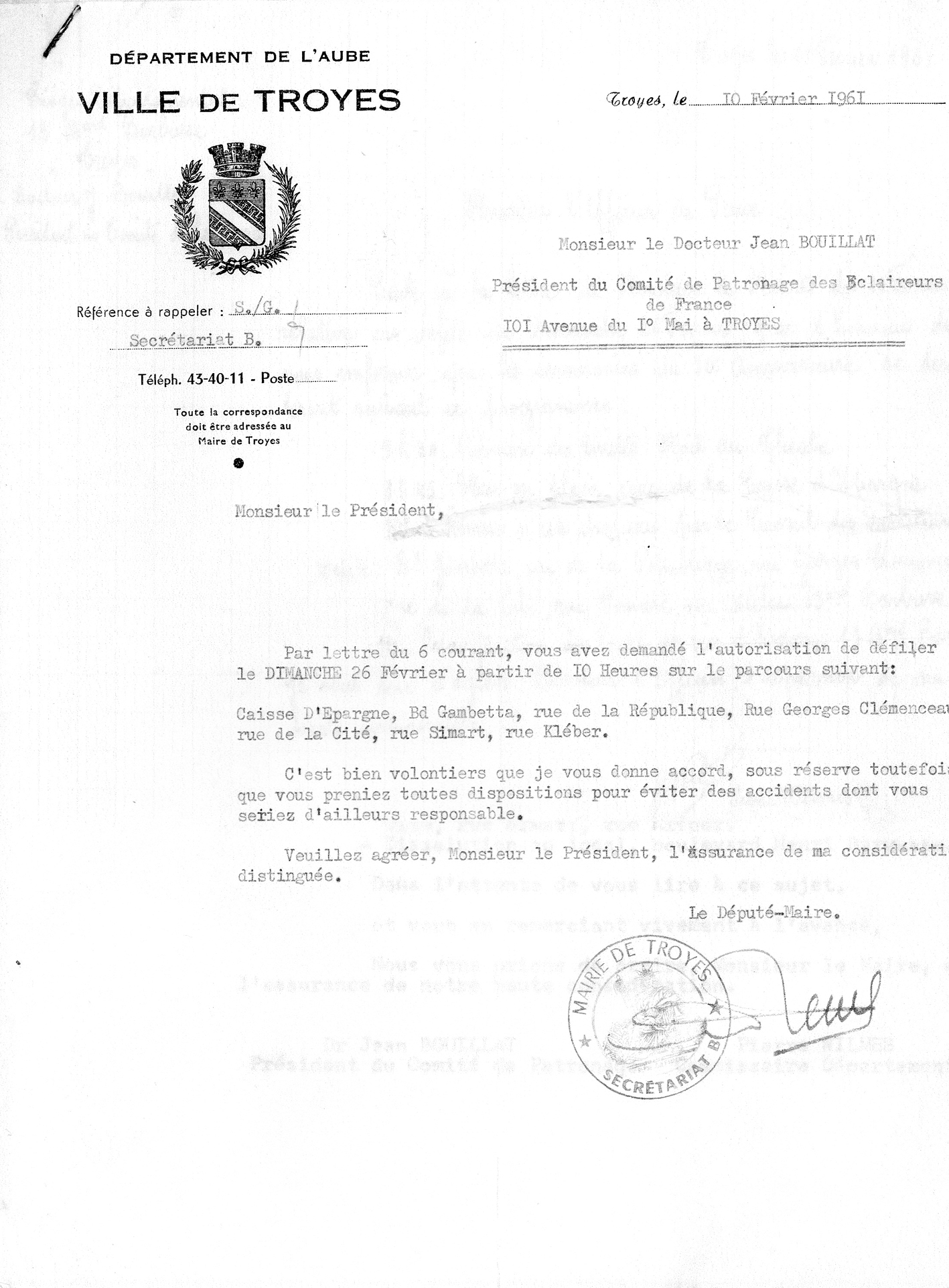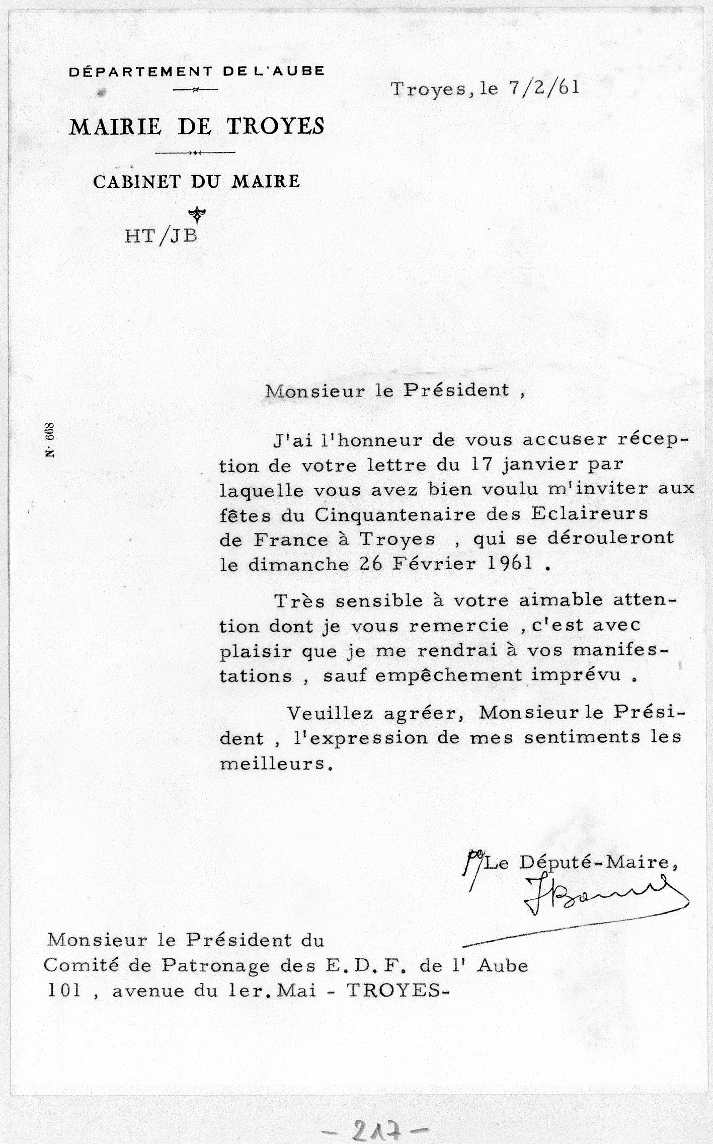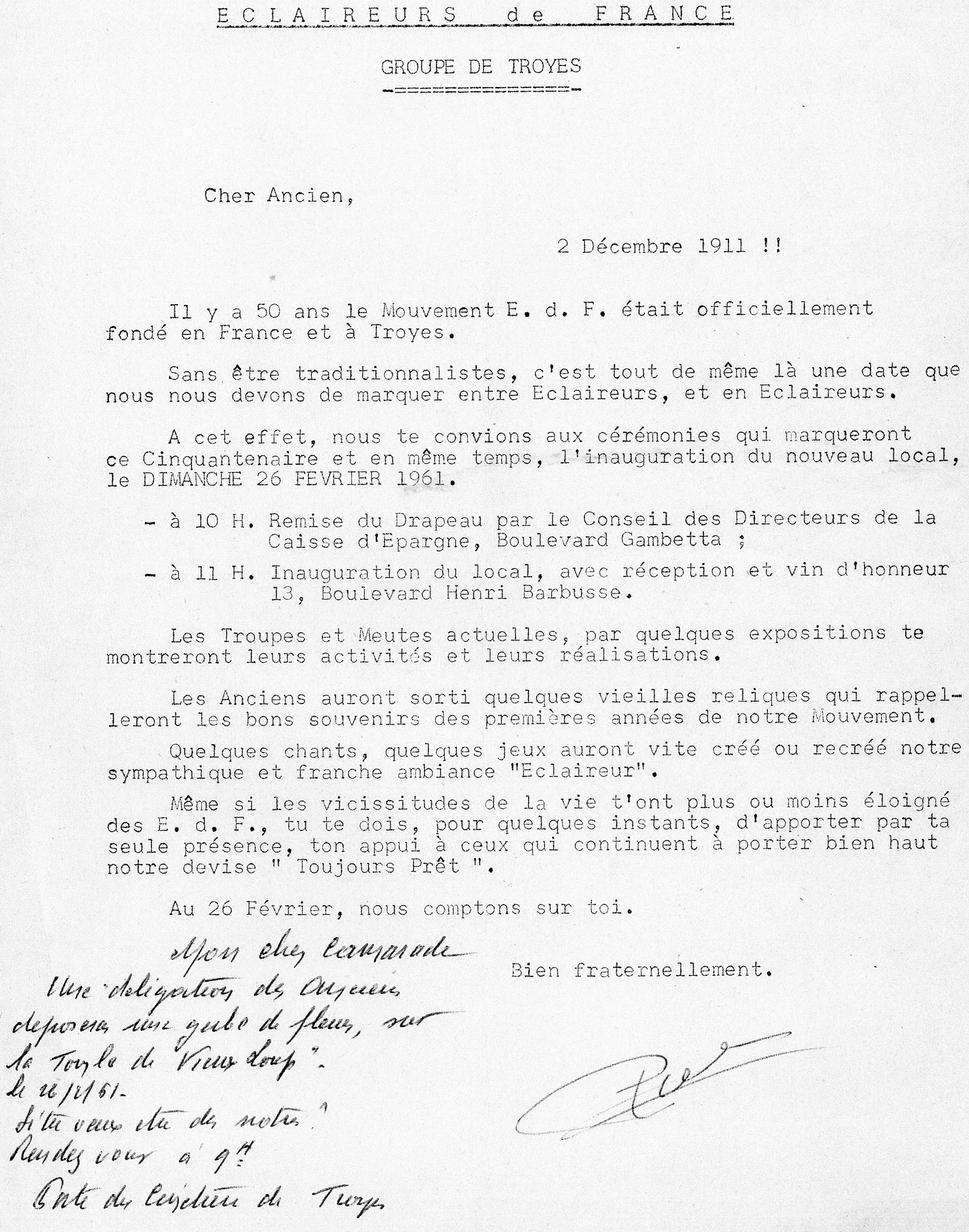 – 1947 : formation d’un Comité de patronage sous la présidence de Jean Scheffer, directeur des Hospices, ancien éclaireur ; à son départ de Troyes, c’est le Docteur Bouillat, ancien également, qui prend la présidence en 1951