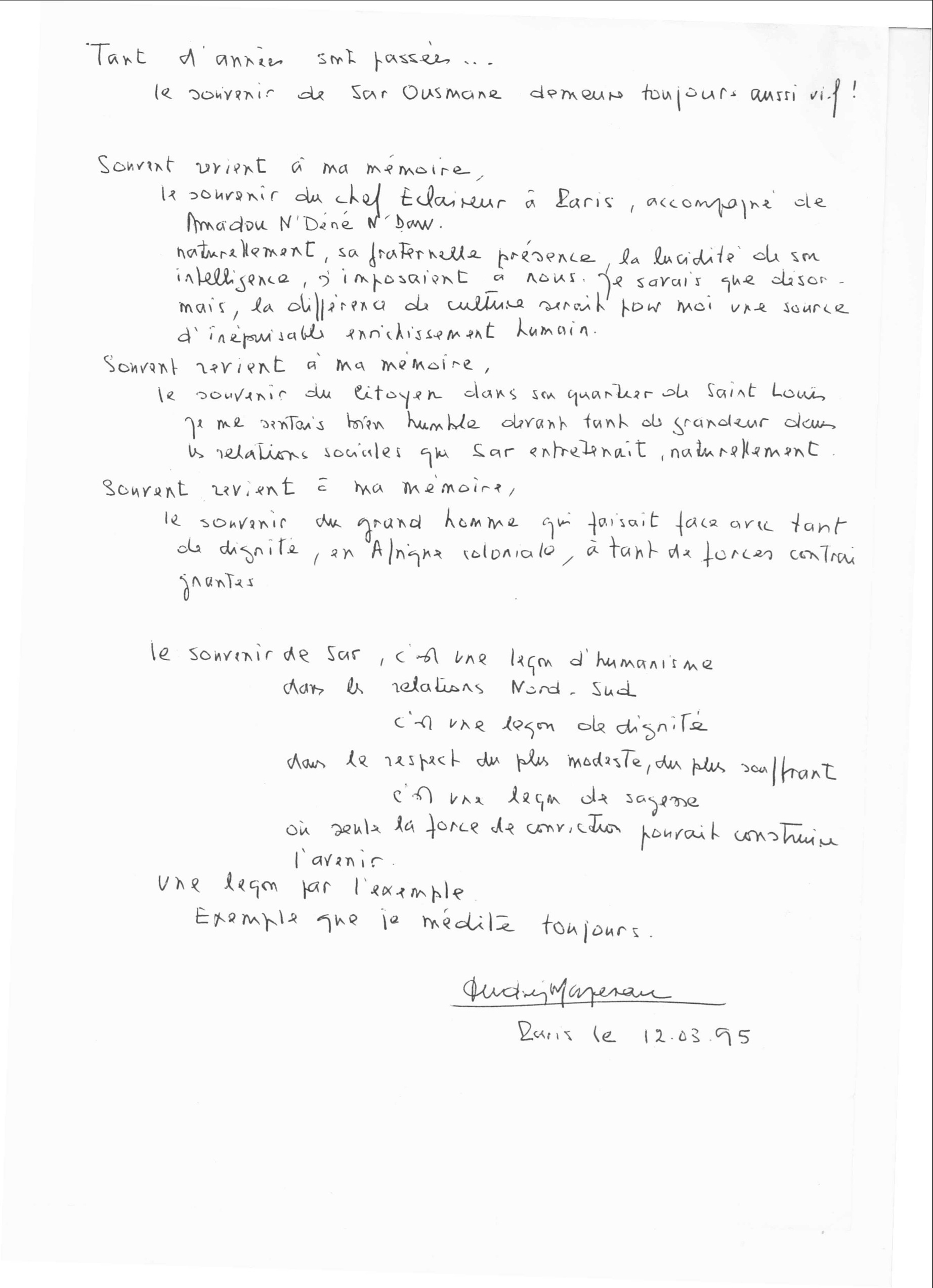 En 1995, lorsqu’elle apprit l’hommage consacré à Sar Ousmane, elle adressa ce message à sa famille et aux éclaireurs.
