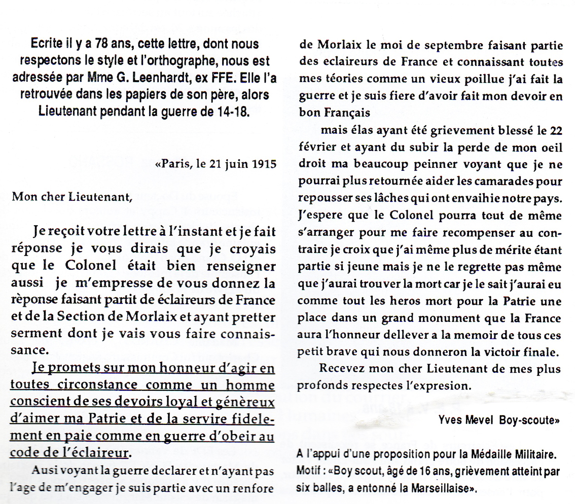 « Avant la guerre de 1914-1918, la première ville à accueillir le scoutisme EDF est Lorient en 1912, soit moins d’un an après la création officielle des Éclaireurs de France. Puis c’est au tour de Saint-Servan (1912), Saint-Brieuc et Rennes (1913) et enfin Morlaix (1914).  La presse locale salue avec intérêt l’événement. Ainsi, à Lorient :