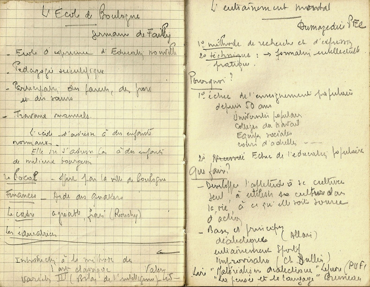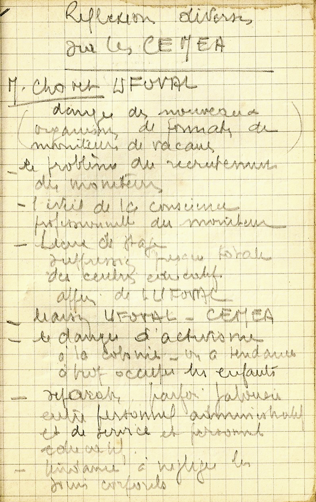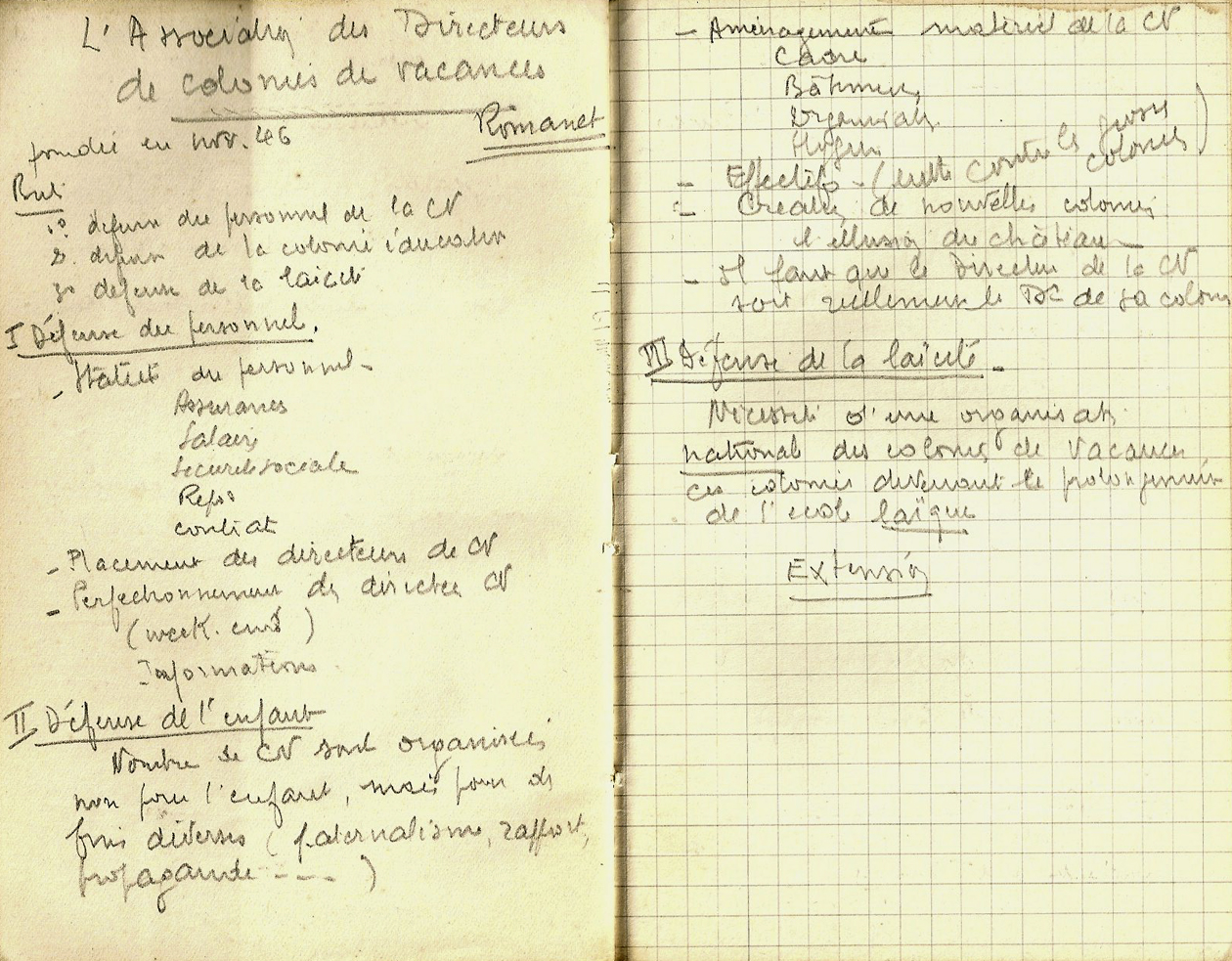 Suivent des informations sur l’association des directeurs de colonies de vacances et ses objectifs, sur l’école expérimentale de Boulogne et sur la méthodologie de l’entraînement mental développée par Joffre Dumadezier dans une optique d’éducation populaire.