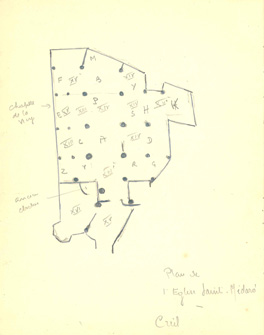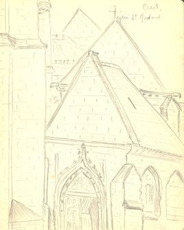 Réveil à 6h30, départ à 7 heures, enquête de 9 heures à midi et de 14 à 20 heures, compte-rendu de 21 à 24 heures. La journée à Creil a également permis de visiter la ville et, en particulier, l’église Saint-Médard, le carnet témoigne d’une prise de notes sur les étapes de la construction du 12ème au 16ème siècle :