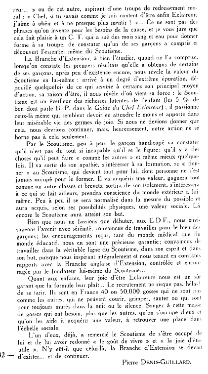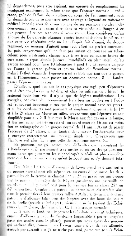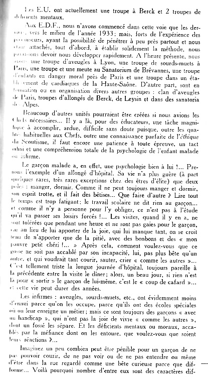 Où il commence à être question d’apporter notre scoutisme aux jeunes handicapés, aux colonies de vacances et, plus généralement, à la protection de l’enfance. On peut y voir les prémices de notre scoutisme d’extension, des CEMEA ou des FRANCAS, mais aussi de notre engagement dans la sauvegarde de l’enfance  :