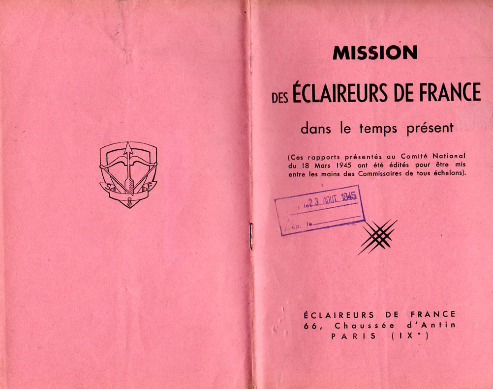À partir d’un rappel des « principes permanents », avec un peu de culture et une relance des activités des branches, y compris l’Extension : « C’est l’honneur des Éclaireurs de France d’être un Mouvement laïque, travaillant en milieu laïque, selon les principes laïques, en même temps que nous collaborons fraternellement avec d’autres Mouvements confessionnels au sein du Scoutisme Français »