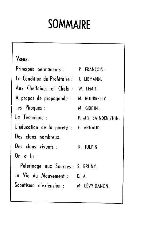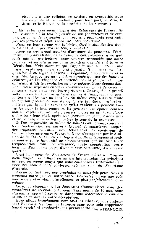 Deux pages sur les « principes permanents » rappellent l’article 1 des Statuts, les résolutions d’Auvillars et les conclusions de l’Oradou, textes qui expriment « l’esprit des Éclaireurs de France ». L’article se termine sur une affirmation : « C’est l’honneur des Éclaireurs de France d’être un Mouvement laïque, travaillant en milieu laïque, selon les principes laïques, en même temps que nous collaborons fraternellement avec d’autres Mouvements confessionnels au sein du Scoutisme Français ». Avec un prolongement un peu inattendu : « Lorsque, récemment, les Jeunesses Communistes nous demandèrent de recevoir chez nous leurs moins de 16 ans, nous n’avons trouvé ni étrange, ni dangereux d’accepter la conversation et de donner notre acceptation. Nous allons franchement vers tous les milieux, nous établissons l’union entre tous les Français sans pour cela supprimer leur diversité ni amoindrir leur personnalité »