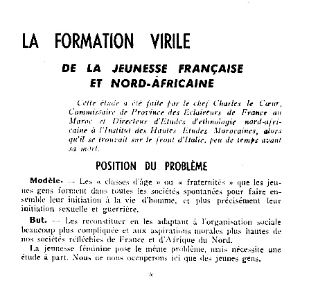 Un article du Chef de novembre 1945, rédigé par Charles le Cœur, Commissaire de province au Maroc mais également ethnologue, ouvre une nouvelle réflexion et propose un certain nombre de solutions tenant comptes des caractéristiques « culturelles » de la jeunesse, française et nord-africaine, dans cette période.