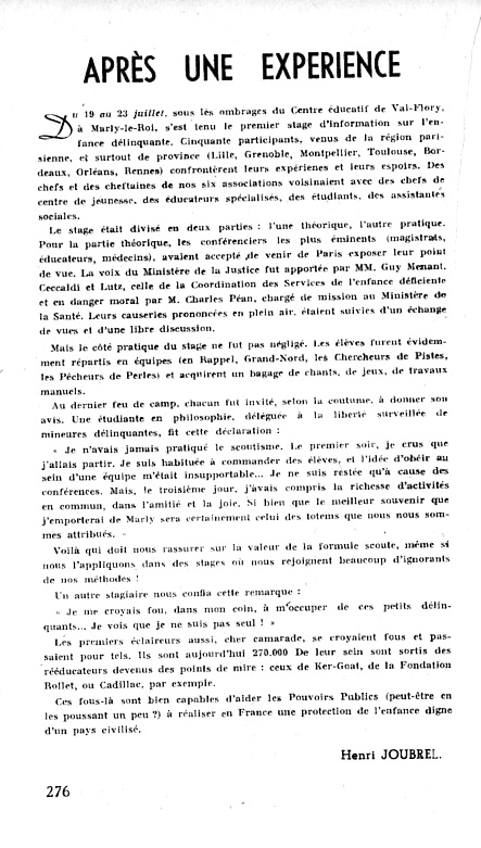 Joubrel consacrera à cette tâche le reste de sa vie, avec, dès le début, un certain nombre d’expériences et, quelques années plus tard, la création de l’ANEJI (Association nationale d’éducateurs de jeunes inadaptés). Mais nous trouvons la trace de son action dès l’été 1945 avec, en particulier, le compte-rendu du premier stage d’information sur l’enfance délinquante, en juillet 1945 à Marly-le-Roi. L’intérêt du scoutisme y est confirmé…