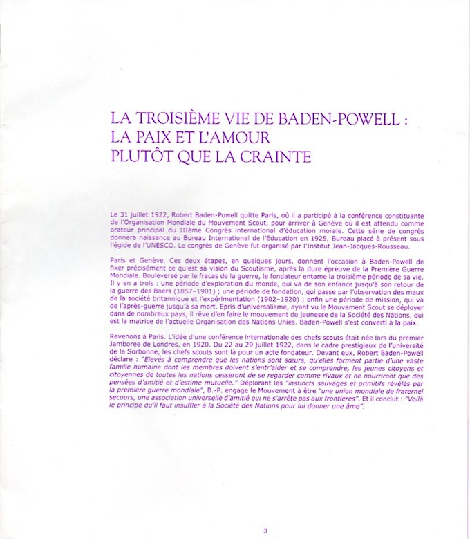 Sous le titre « La troisième vie de Baden-Powell », le Bureau Mondial du Scoutisme a publié en 2007, une réédition du rapport présenté par B.P. à l’occasion du IIIème congrès mondial d’éducation morale. Nous en reprenons ci-après les principaux éléments, à l’exception d’une page présentant les principes fondamentaux du scoutisme.