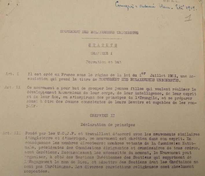 Les documents qui suivent ont été retrouvés par Maryvonne Colomb au PAJEP (pôle archives des associations de jeunesse et éducation populaire) à Créteil. Ils témoignent de la première étape de la mise en place, en France, d’un scoutisme féminin, à partir des U.C.J.G. et en liaison avec elles. Nous présentons successivement :