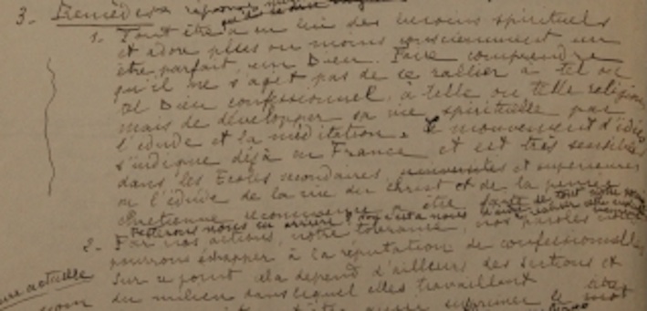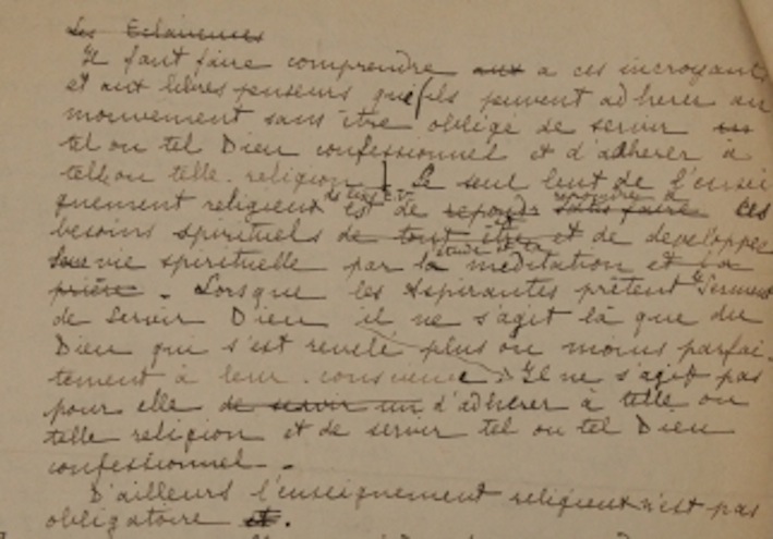 Ces textes semblent montrer les difficultés, voire les contradictions, dans lesquelles se débat ce nouveau Mouvement : conserver sa référence religieuse, en liaison avec les U.C.J.G., mais, simultanément, affirmer une ouverture à toutes, répondre aux « libres penseurs » et aux « incroyants »… et échapper à l’image d’une oeuvre confessionnelle. Il est question de répondre à « des besoins spirituels » mais sans être obligé de « servir tel ou tel Dieu ».